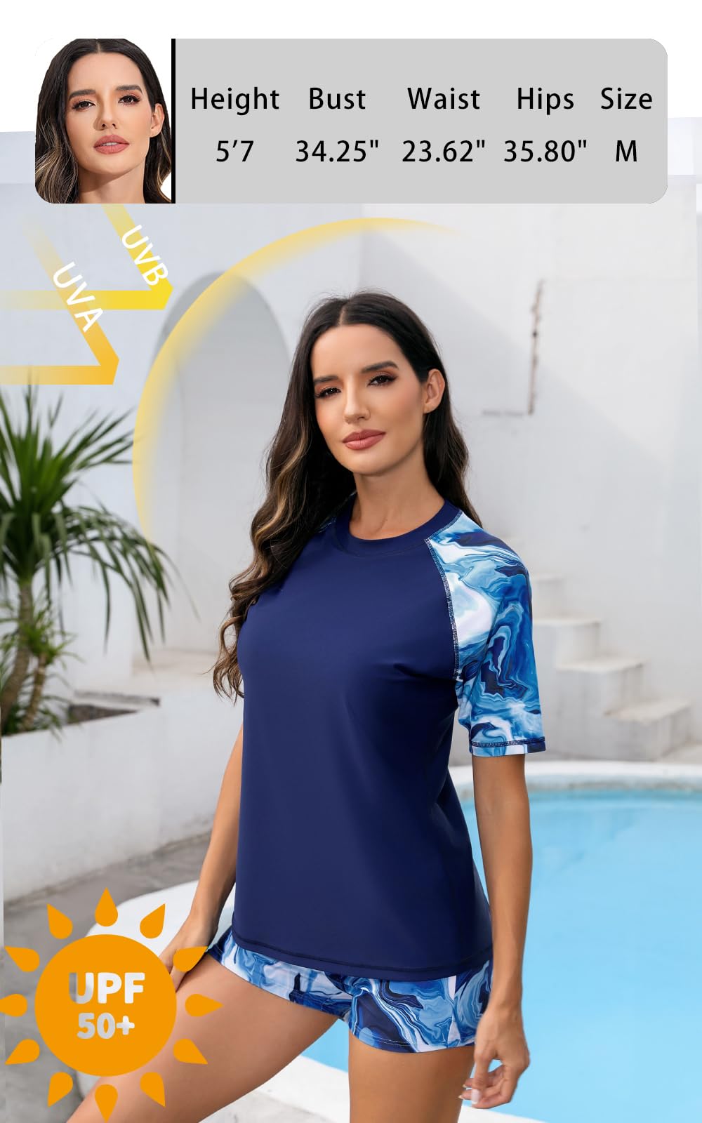 • Two Piece Set: short sleeve crew neck rash guard top paired with boyleg board shorts makes a sporty and modest swimsuit set.