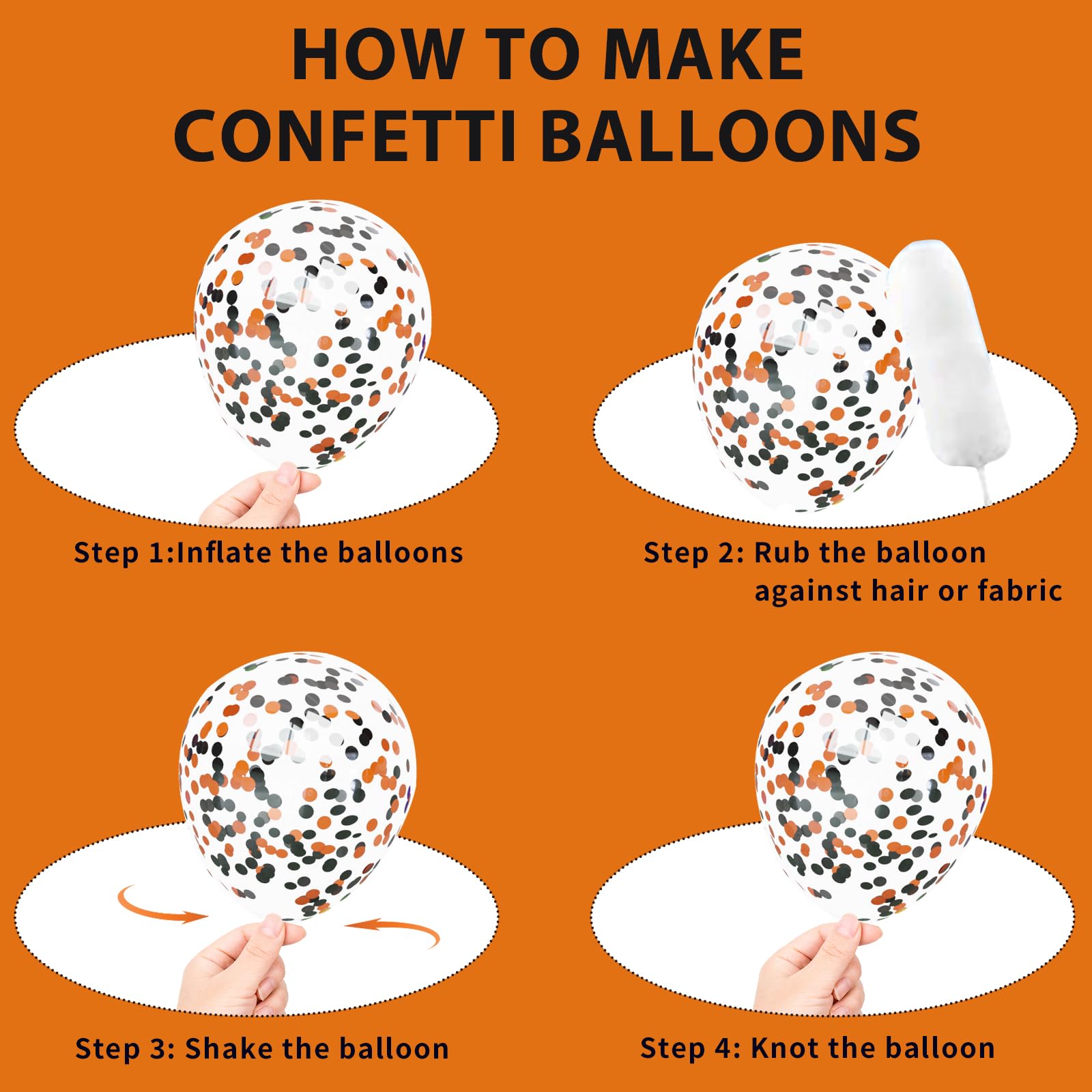 • Easy to use:These Halloween party balloons are easy to inflate with air or helium. Once inflated, shake the confetti balloon and then gently rub it with your hair or a dry cloth and the confetti will stick to the sides of the balloon. adding a festive and eye-catching touch to your decorations.