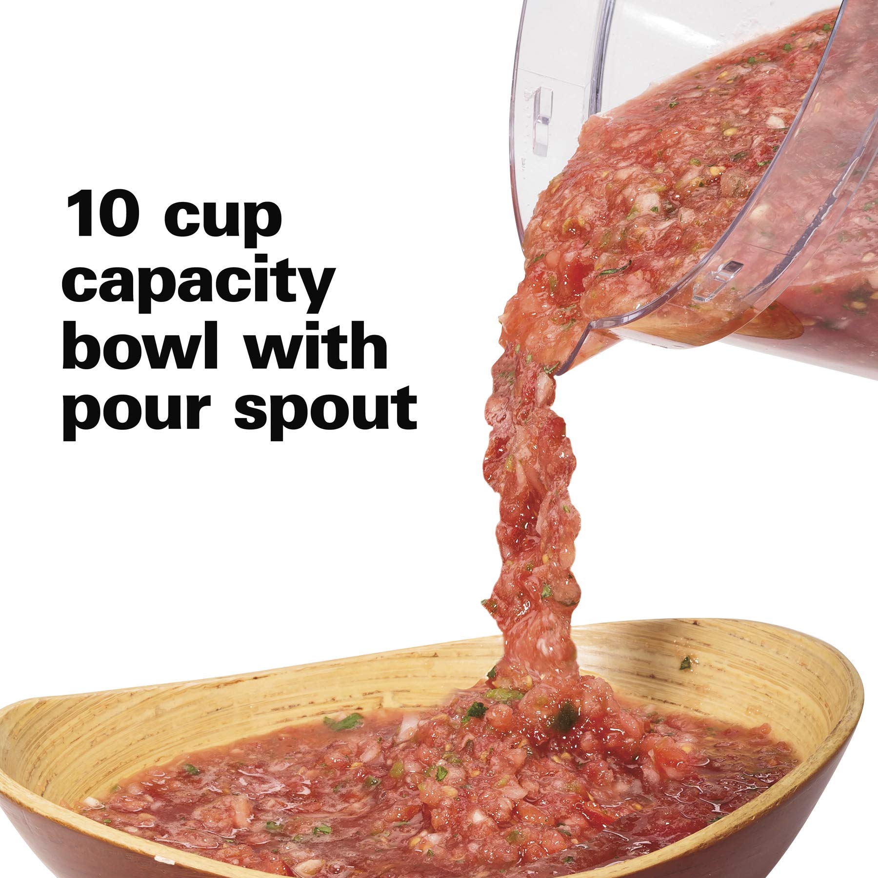 • LARGE 10 CUP BOWL WITH POUR SPOUT. You’ll be able to process 10 cups of food without having to stop to empty the bowl. Since the bowl has a pour spout, you can transfer dressings, sauces and purees into serving or storage containers without making a mess.
