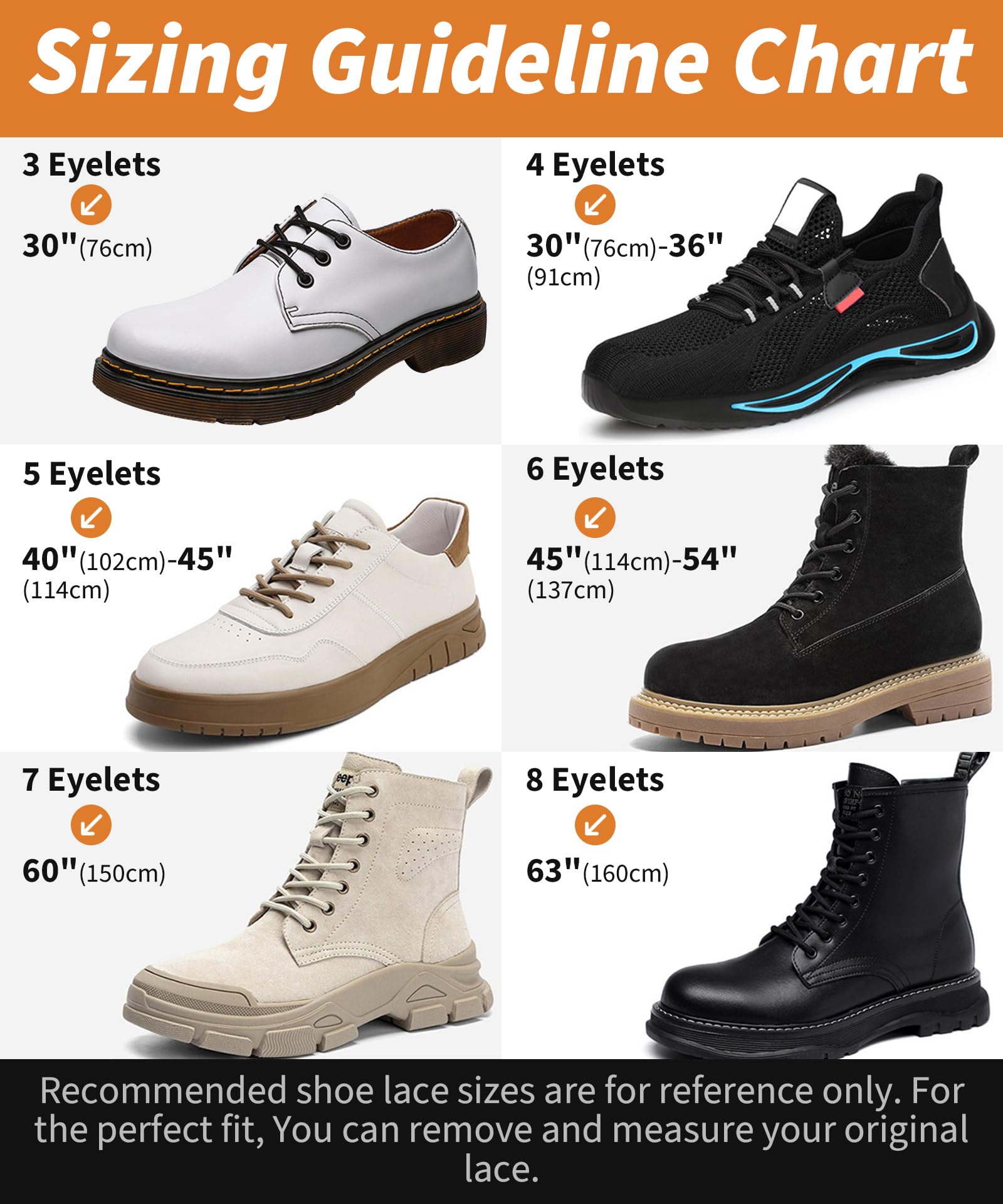 • Shoelaces Diversity:These durable boots shoelaces are 10 colors of 6 sizes(30”,36”,40”,45”54”,63”),When you choose the size,you can make a measurement of your original shoestrings.or according to the eyelets of your shoes to get the right length.