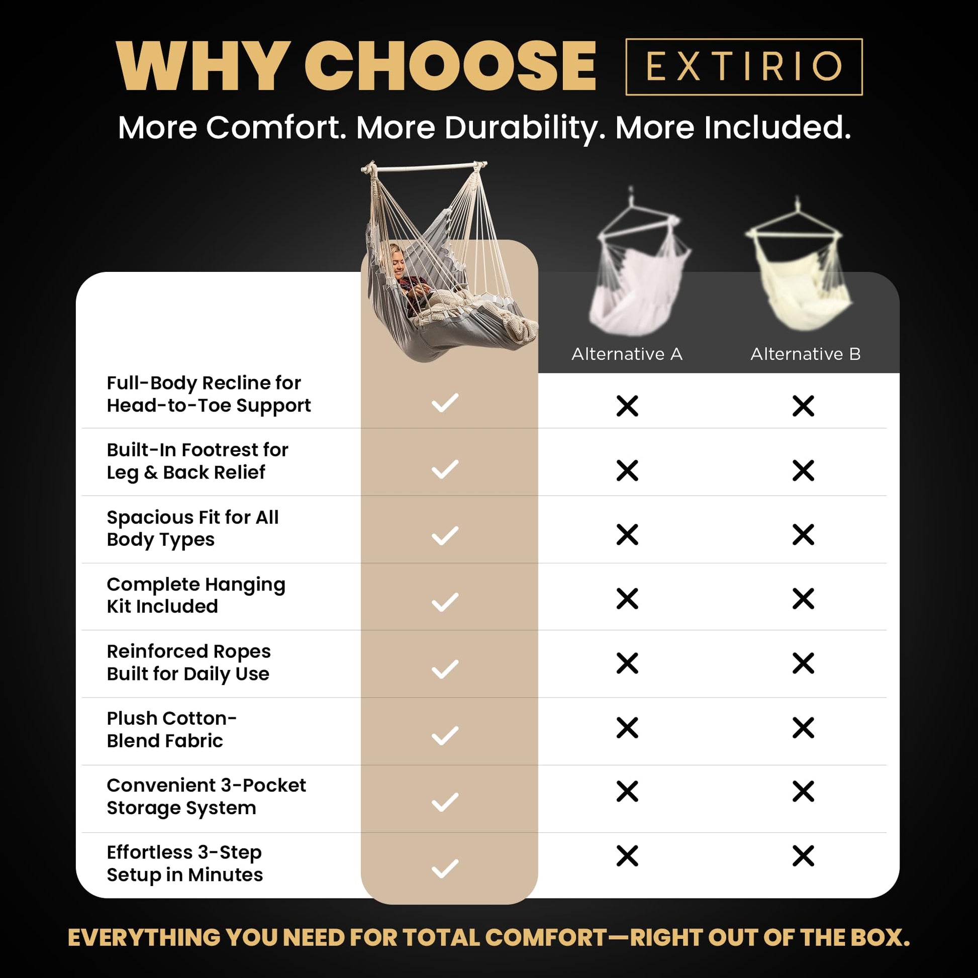 • 𝐒𝐩𝐚𝐜𝐢𝐨𝐮𝐬, 𝐅𝐮𝐥𝐥-𝐁𝐨𝐝𝐲 𝐂𝐨𝐦𝐟𝐨𝐫𝐭 – Unwind fully in our hammock chair with footrest, made for deep relaxation and full-body support. With a built-in foot rest and breathable cotton blend, it’s the perfect hanging chair for bedroom, patio, or porch—and the ideal indoor swing for adults seeking a cozy reading nook or napping spot.