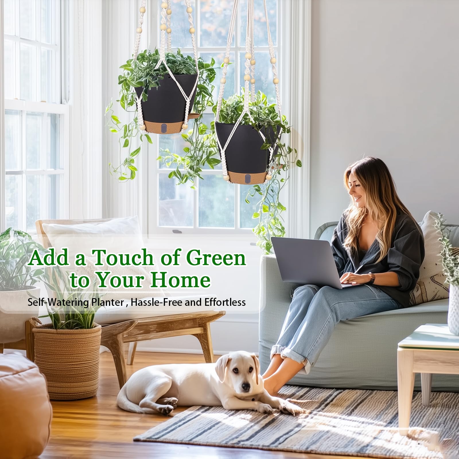 • 【Smart Self-Watering System】 Our hanging plant pots come with a REMOVABLE RESERVOIR TRAY that stores 7-10 day water supply. Absorbent cotton ropes automatically deliver moisture to soil when needed - ideal for vacations or busy lifestyles. Spend less time watering hanging baskets for indoor plants!