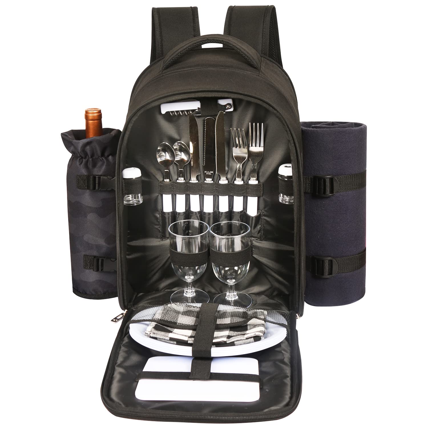 • PREMIUM PICNIC SUPPLIES - Cutlery set includes 2×(stainless steel knives, forks, spoons, dinner plates, cotton napkins, wine glasses ) & 1×cheesetter knife & 1×bottle opener & 2×Salt/pepper shakers & 1×plastic chopping board, + Water resistant fleece blanket,size 45x53 inch