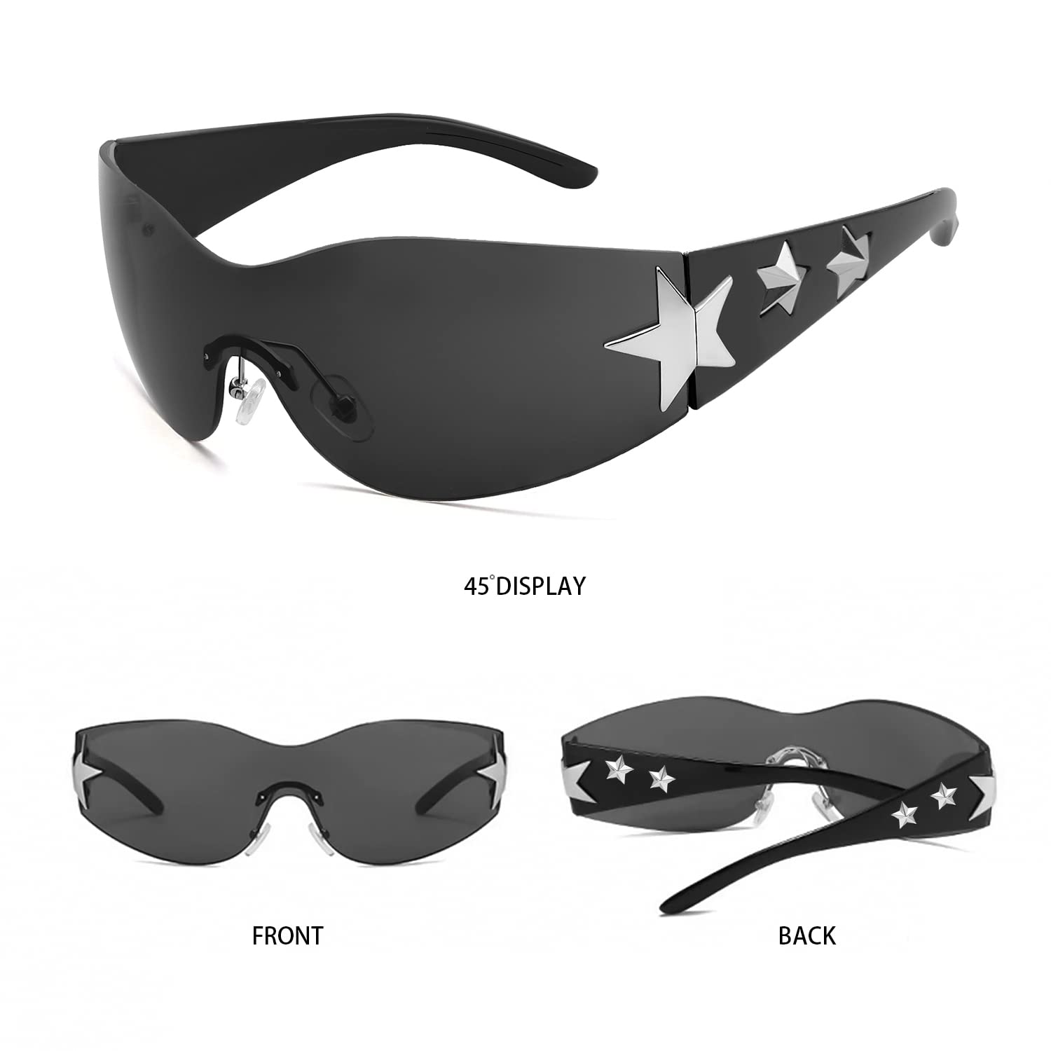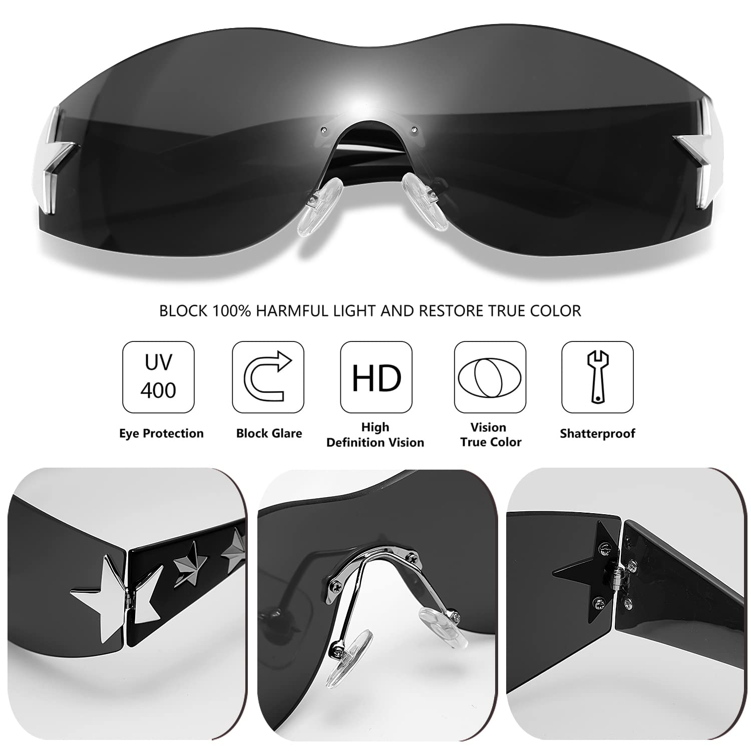 Haqptul Rimless Y2K Sunglasses Star Wrap Around Glasses 2000S Accessories for Women Men Trendy Fashion Cool Shield Shades (Black/White)