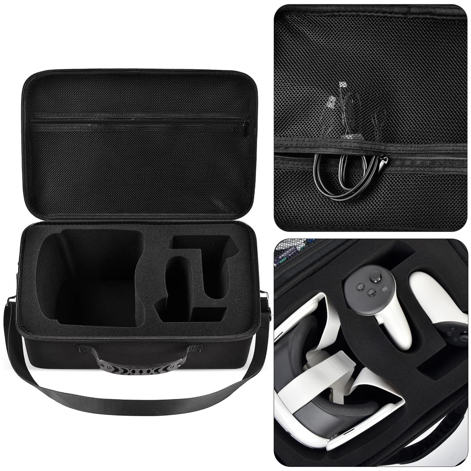 • Carrying Case for Meta Quest 3: Portable quest 3s Carrying case box is specially designed for Oculus Quest 2 / for meta quest 3/ quest 3S Headset and Controllers, but not for the elite strap. Also come with a zipper mesh pocket for charging cable, power adapter and other accessories. Didn’t fit for Quest 2 3 Elite Strap. Dimension: 14 x 10 x 4.6 inches.