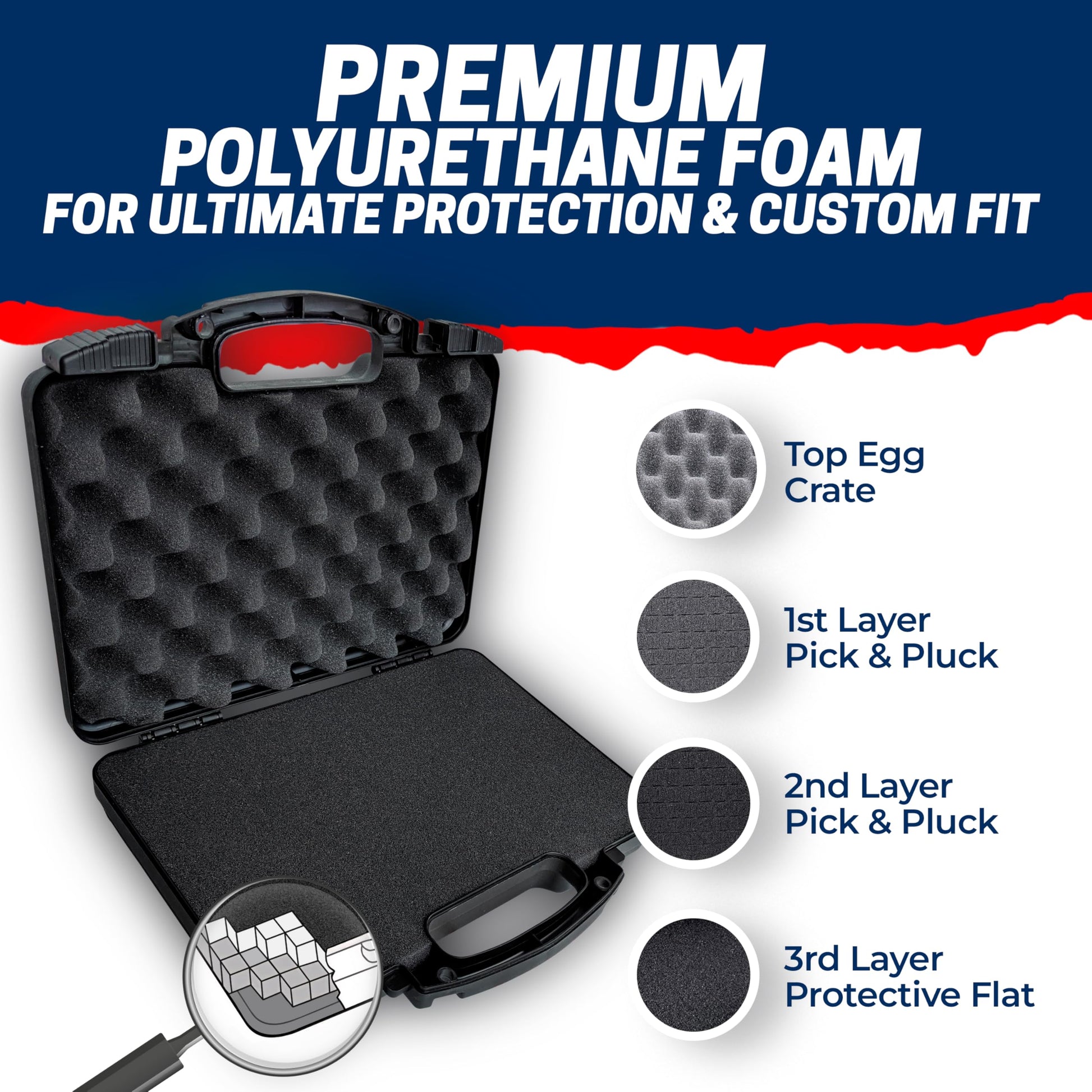 • DURABILITY: We know that when it comes to protecting your firearm, nothing can beat the strength and durability of our Hard Pistol Case. Its carbon fiber reinforced DS3TeK polypropylene construction makes it crush-resistant so even under pressure this carry case won't break. The best part is that it also has replaceable foam which you can customize according to your needs and preferences!