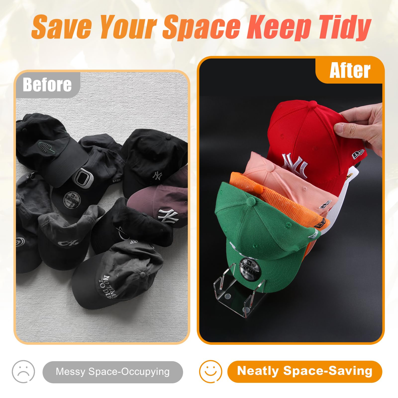 • Stylish Decoration: Fashionable transparent appearance, minimalist design, baseball cap organizer is suitable for various room decoration styles. You can place all your baseball caps in your closet, bedroom, hallway, living room, garage or storage rack.