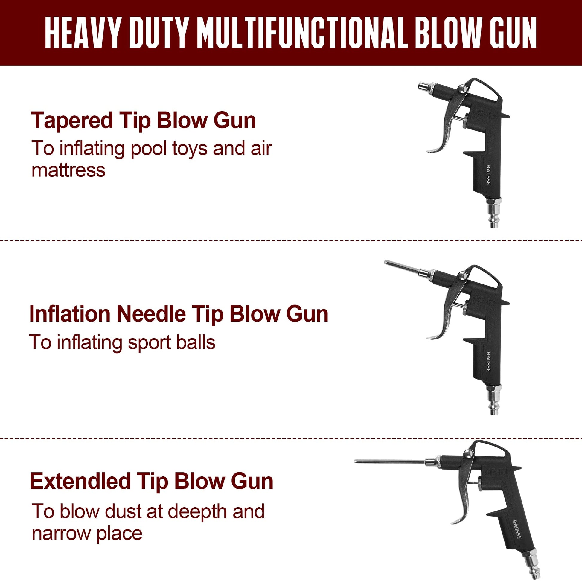 • Standard Blow Gun with Nozzles: All metal construction standard air blow gun with 1 nozzles and 2 inflation needles, all-purpose use for bicycles, air mattresses, balls, etc.