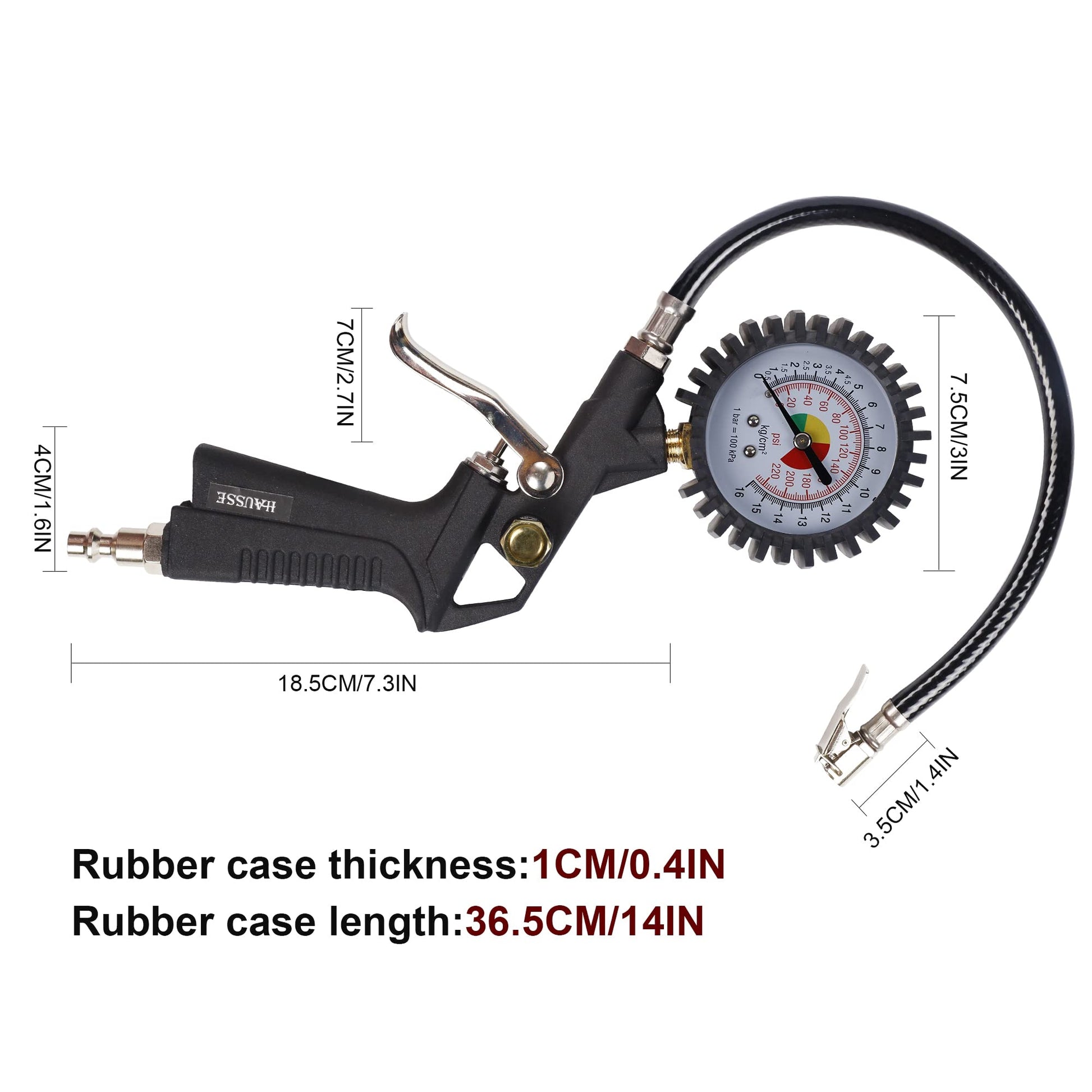 • Tire Inflator with Gauge: Tire inflator with ventilation valve and pressure gauge, air blow gun are all combined in one easy to use unit. Clear and easy to read display dial with 0-220 psi gauge (No more than 140 PSI is recommended). Heavy duty metal construction that is corrosion-resistant and very durable.