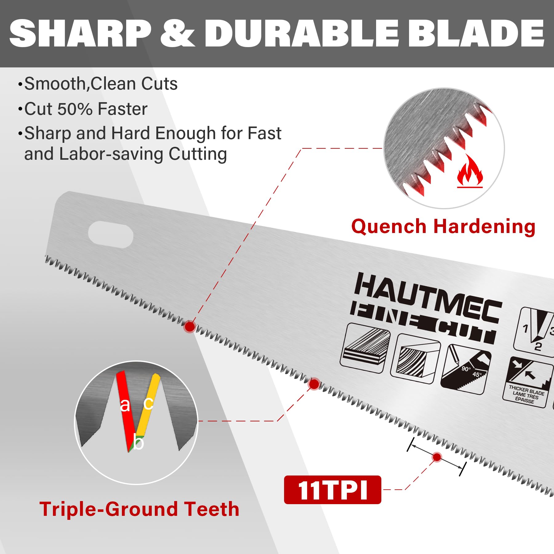 • 【Durable & Stable Cutting Performance】Thick blade with 11 TPI, induction hardened tri-grounded teeth slice through wood with ease, and the polishing and anti-rust coating on blade surface reduces the cutting friction, maintaining protection for longevity and performance