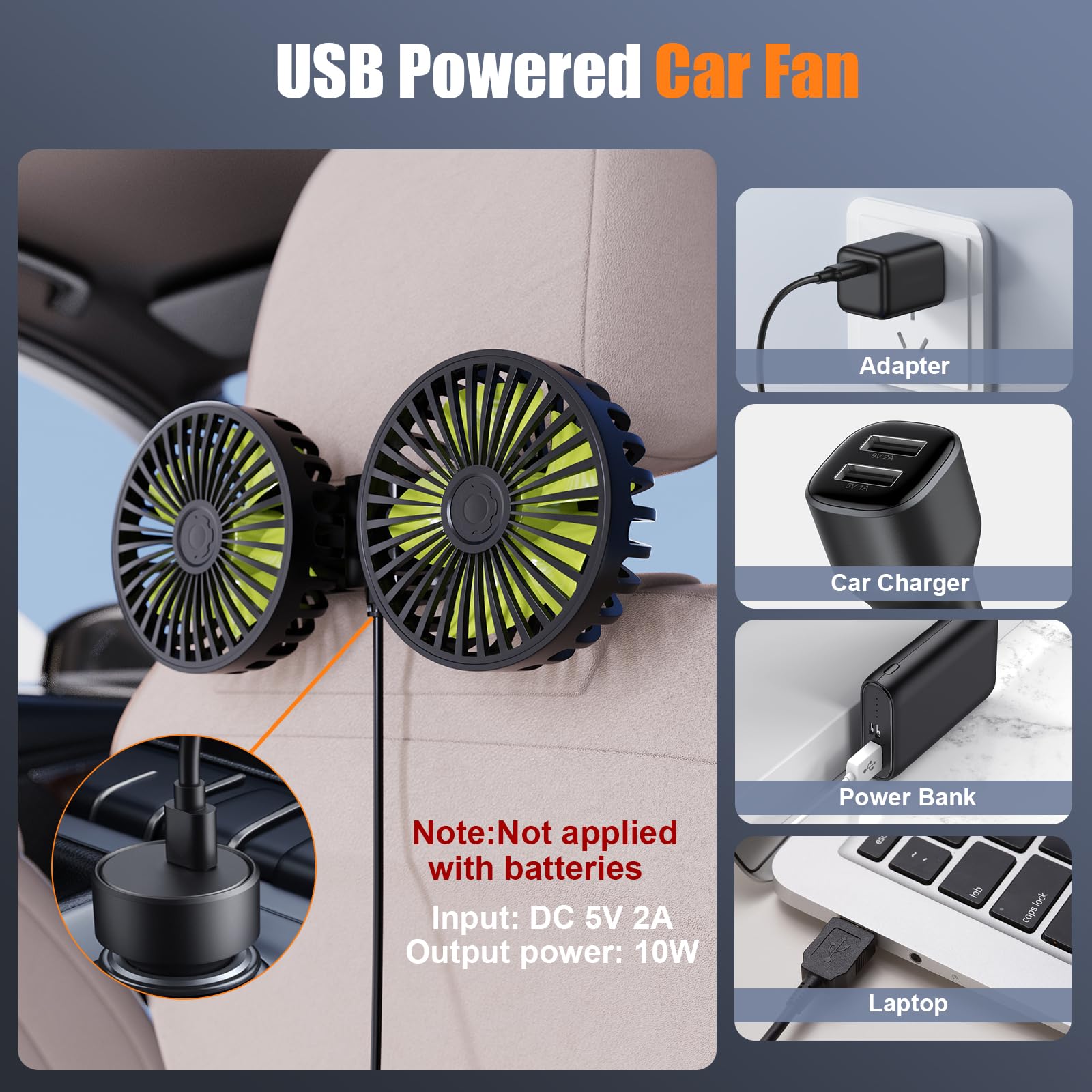 Hayousui USB Car Cooling Fans for Backseat: Dual Head Car Fan for Kids 3 Speeds 360° Rotatable Vehicle Rear Headrest Fans 5V Powerful Electric Air Circulation Fan for Sedan SUV RV Truck (USB Plug)