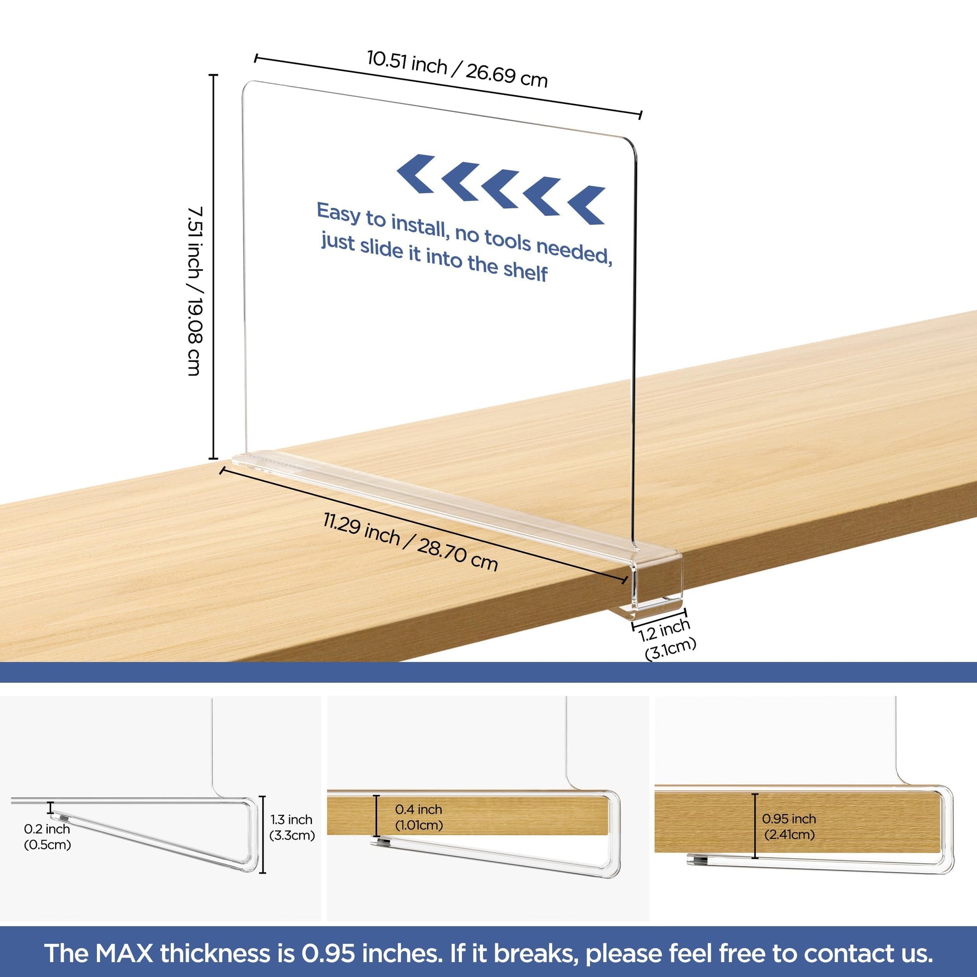 • KEEP YOUR CLOSET ORGANIZED: Great way to separate clothes or purses, our shelf dividers can keep them in place. Definitely, it can free up more space to make your house look better. The fly in the ointment is that please don't mount it on a board longer than 0.95 inches, it will cause it to break.