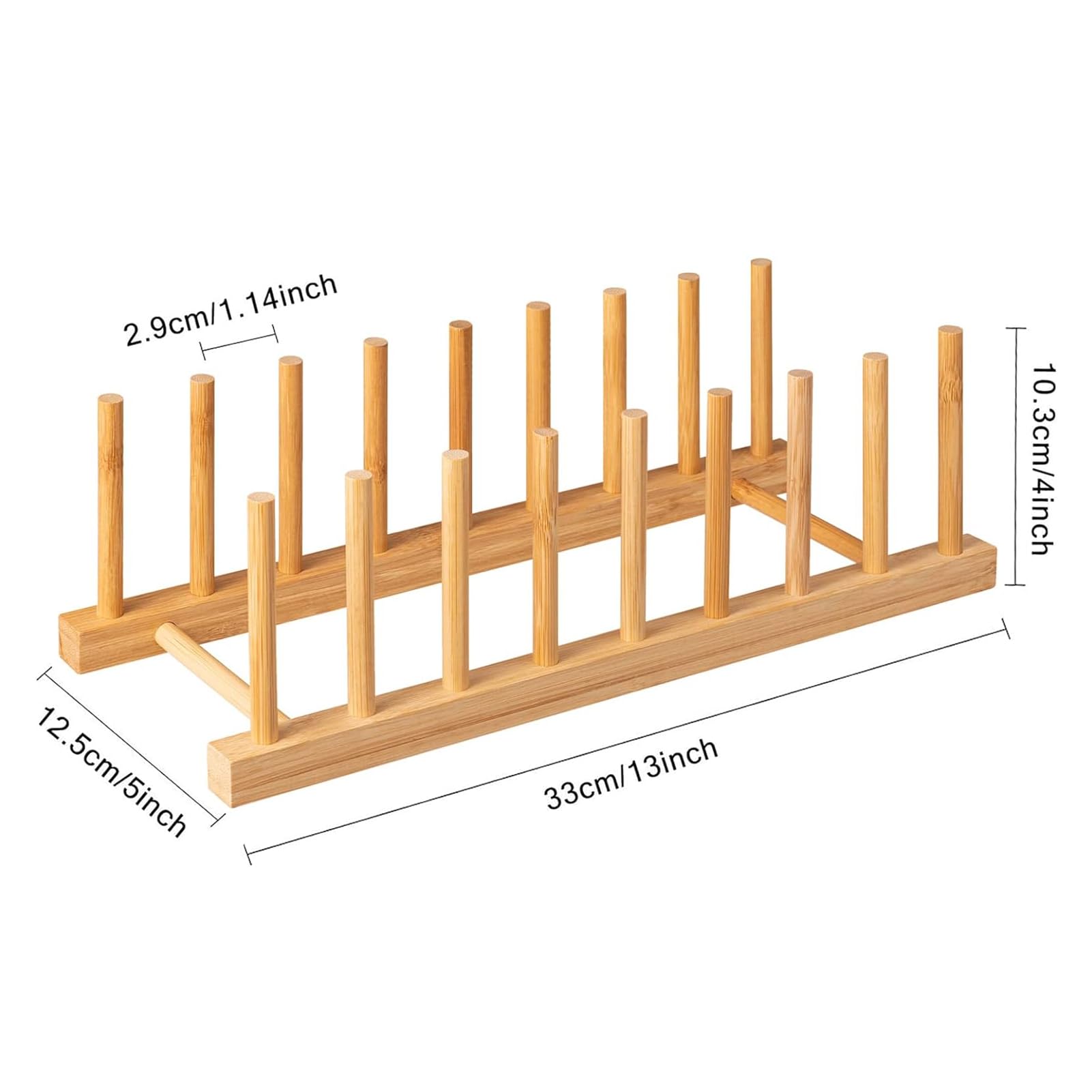 • Easy to install: 18 vertical bamboo pegs (9 on either side) create 8 slots for plates or pot lids., the two long racks and two pegs, each rack have two holes. To make sure it will connect each pieces more tighter, it is minus tolerance design. When install, push the pegs into side racks with a little big pressure, then the whole rack will be tight. Please check the size of the Bamboo Wood Rack on my pictures before you purchase it.
