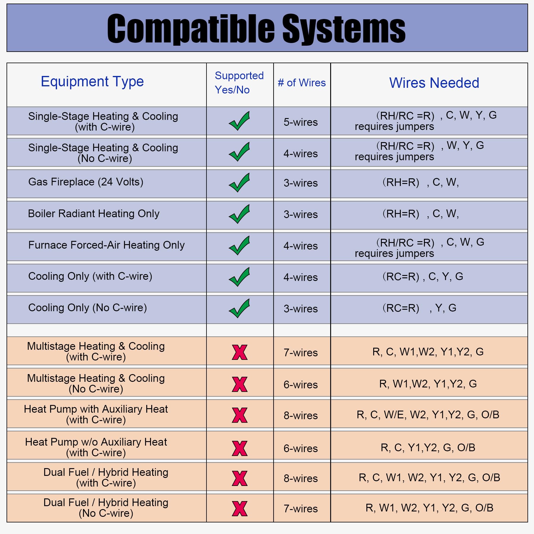 • 【Incompatible Systems】Does not work multistage systems (1H/2C, 2H/2C), HVAC heat pump systems (2H/1C, 4H/2C), PTACs, 3-wire hydronic (hot water), dual fuel/hybrid heating. Does not work line voltage systems (120-240V electric baseboards heat); mini split heat pump air conditioner, RV air conditioners mach and roughneck series.
