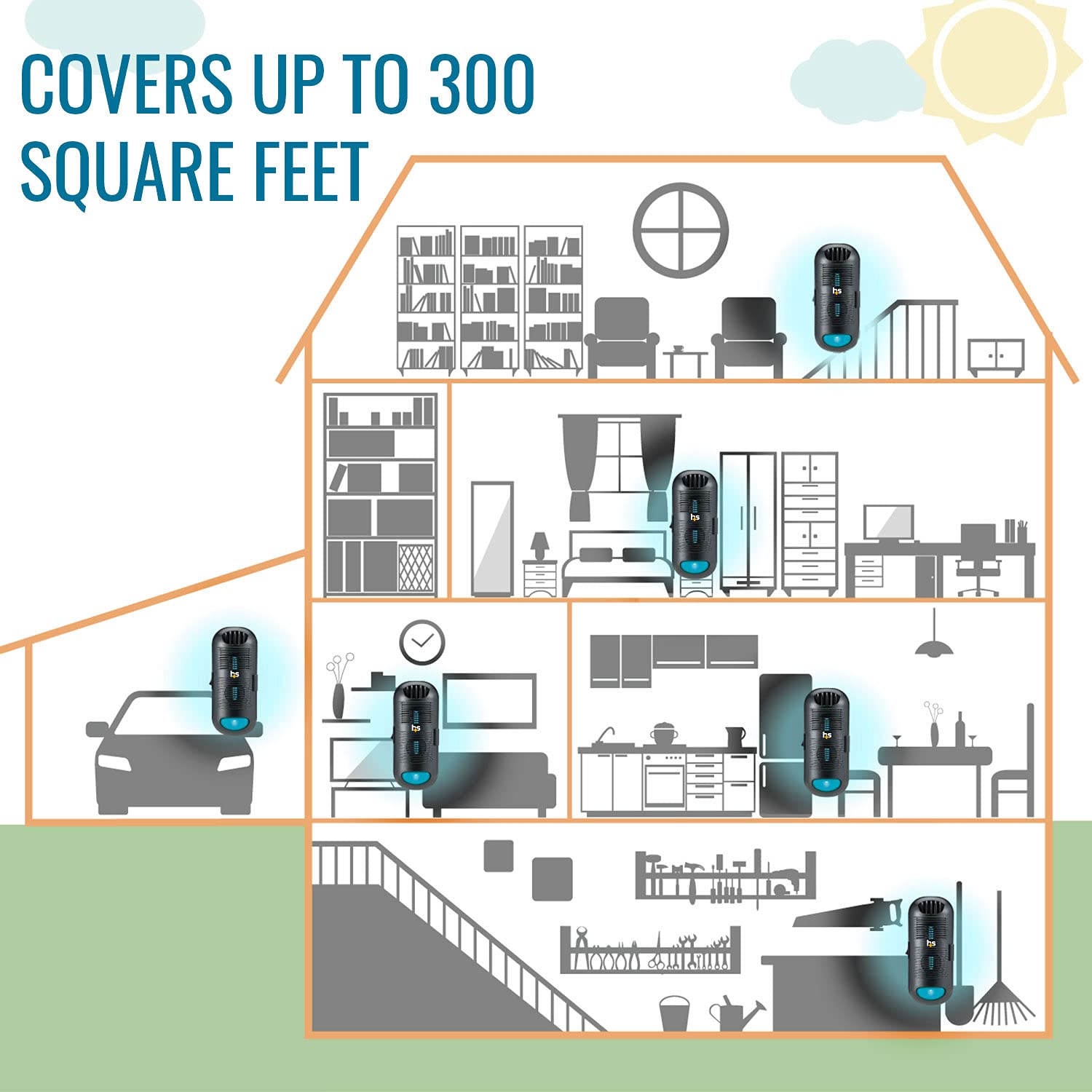 • PORTABLE AIR PURIFIER plugs in to any outlet and starts cleaning immediately. Unit covers up to 300 square feet making it the perfect air freshener for bedrooms, bathrooms, kitchens and living rooms