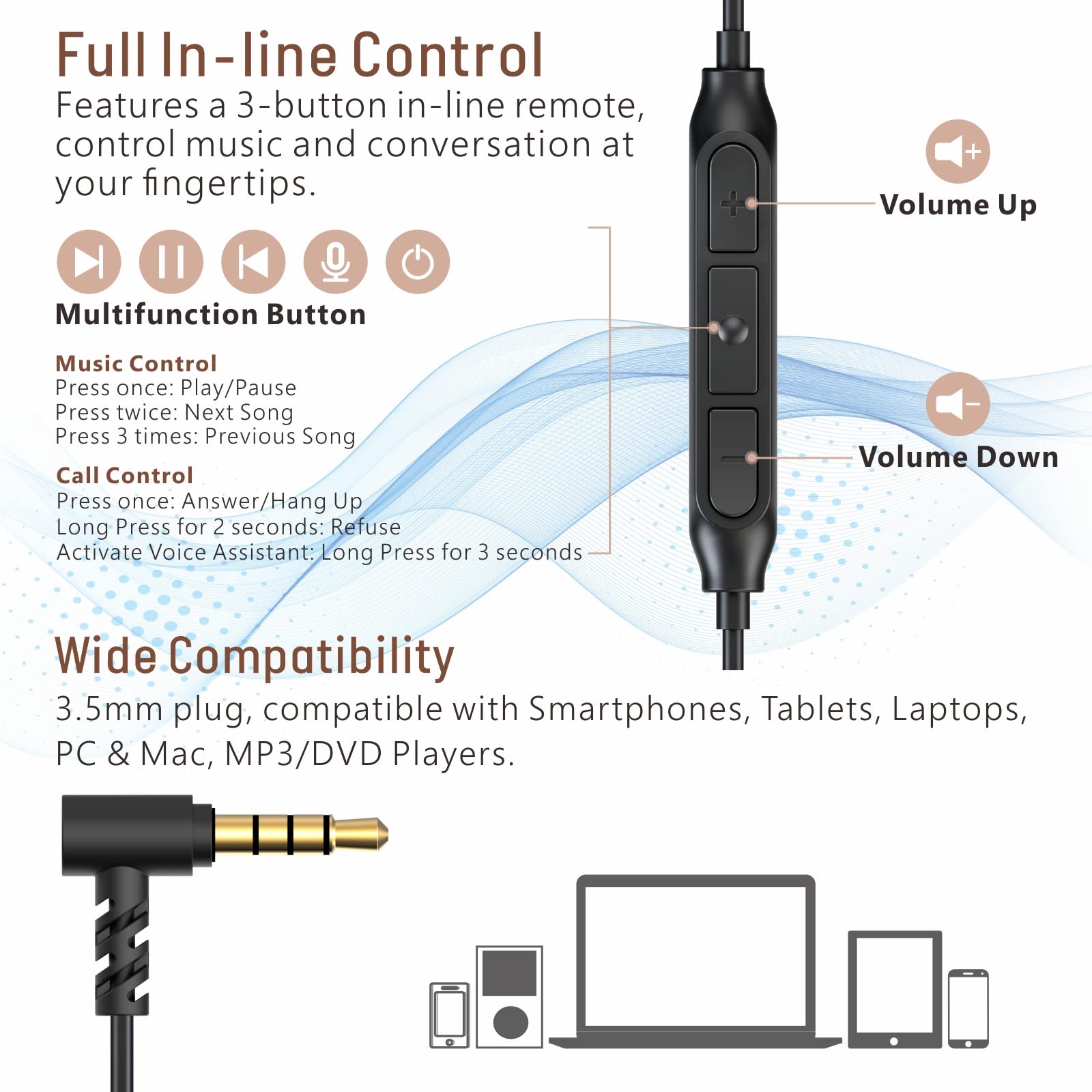 • Wide Compatibility: The universal three-button remote with a microphone lets you adjust volume, skip tracks, handle calls, and use voice controls on both iOS and Android. The 3.5mm connector works with CD players, laptops, digital audio and MP3 players