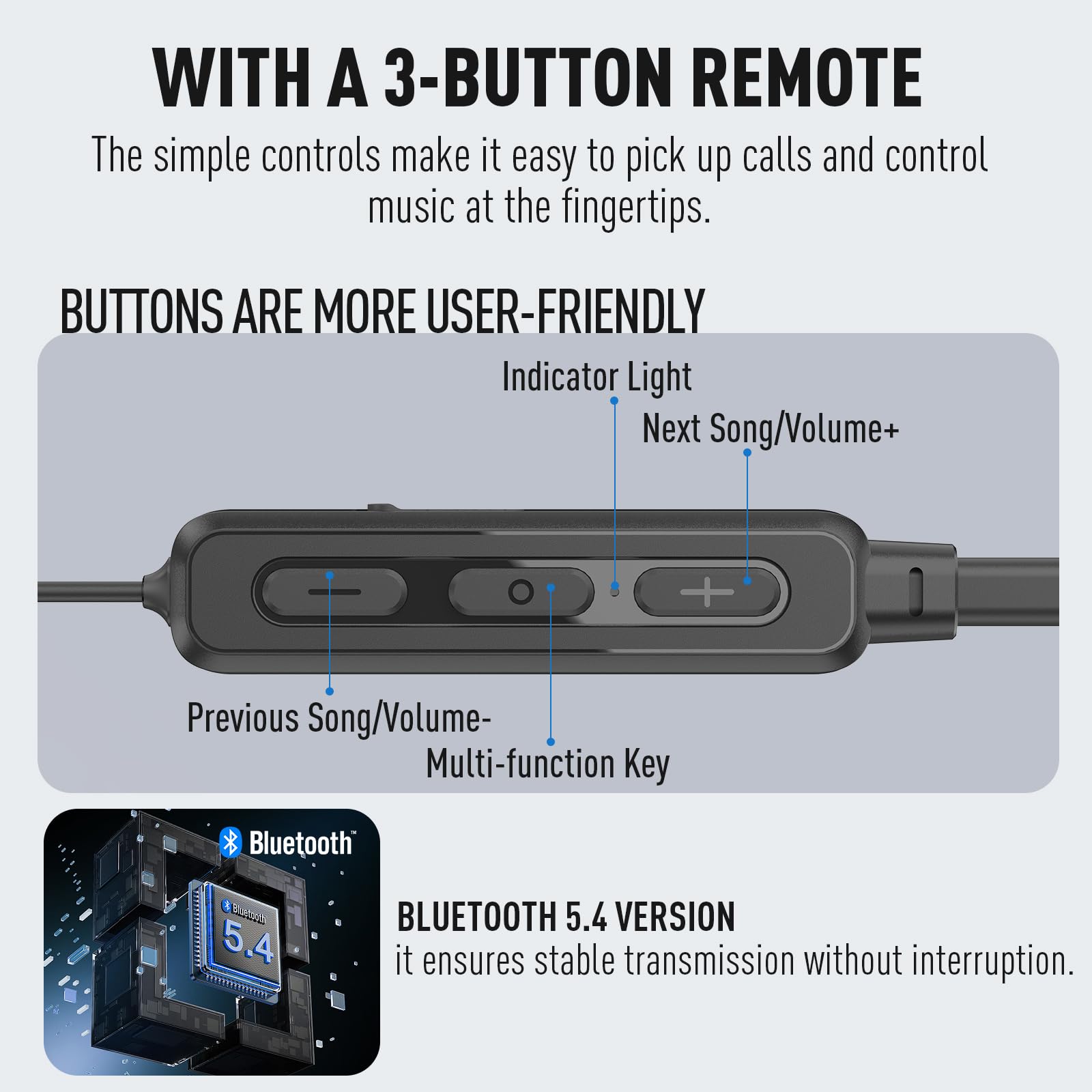 • Advanced Bluetooth V5.4 Connectivity: The earbud features the latest Bluetooth 5.4 version, it stutter-free and reliable with a good range. With a 3-button in-line remote, it lets you answer phone calls, control music, adjust volume and more very easily