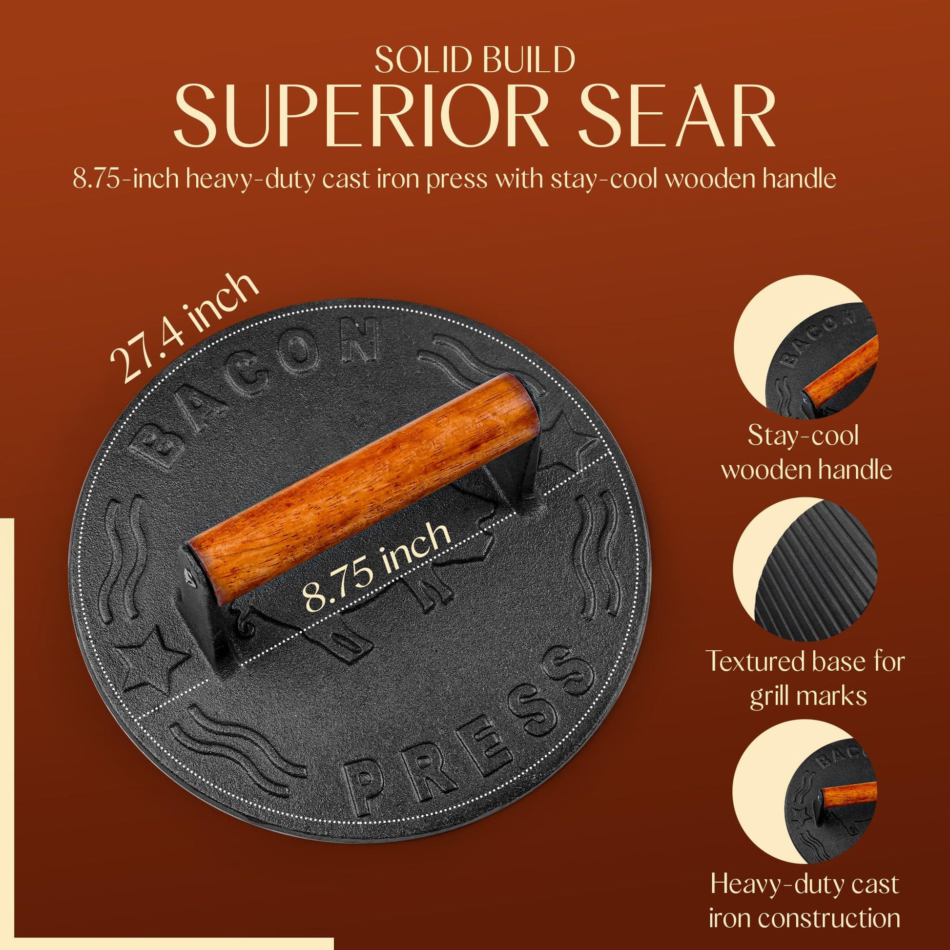 Heavy-Duty Cast Iron Burger Press 8.5 Inch Round Burger Smasher, Grill Press for Cooking Burgers, Bacon, Sandwiches, Steak, Ground Beef, Meats, Sausages, and So On