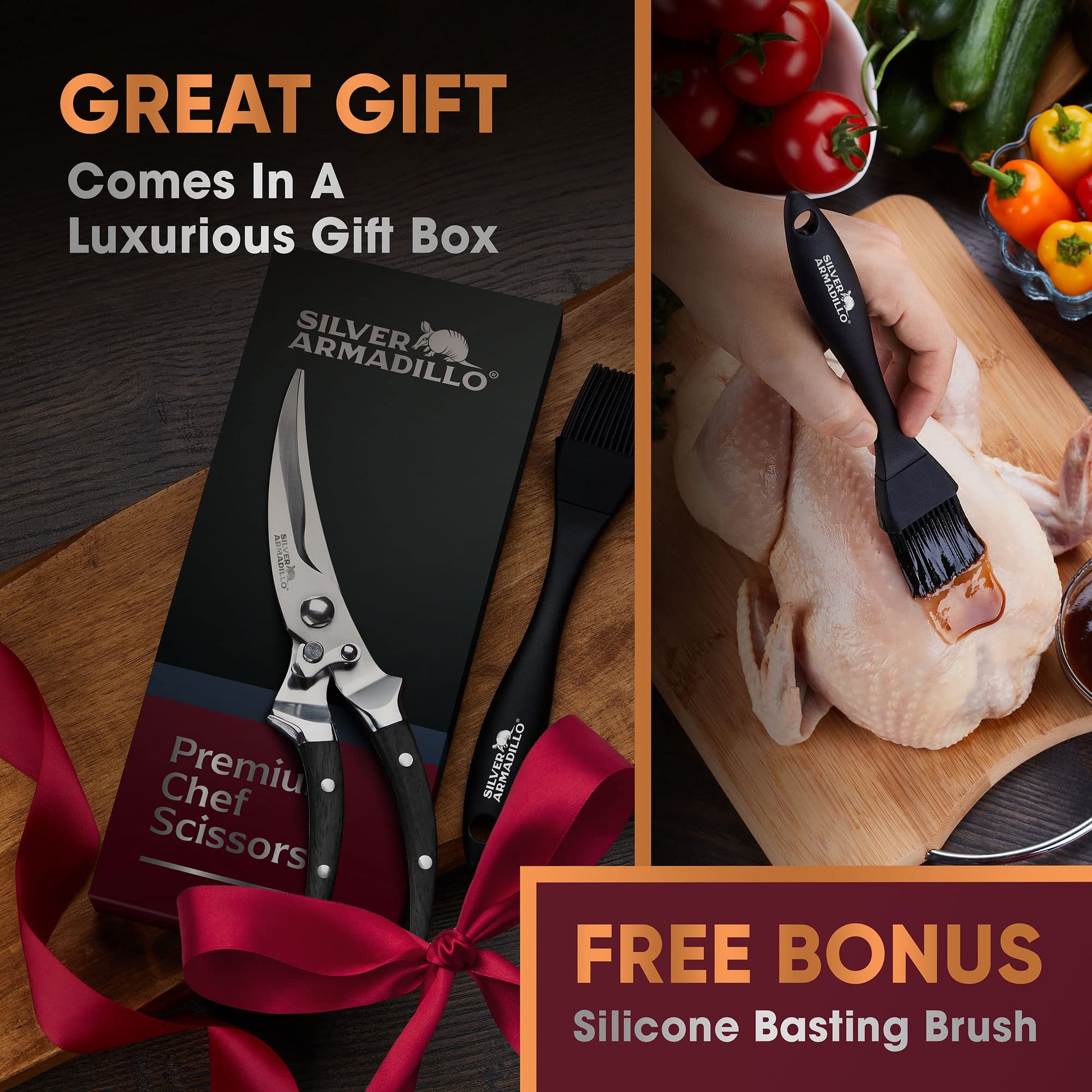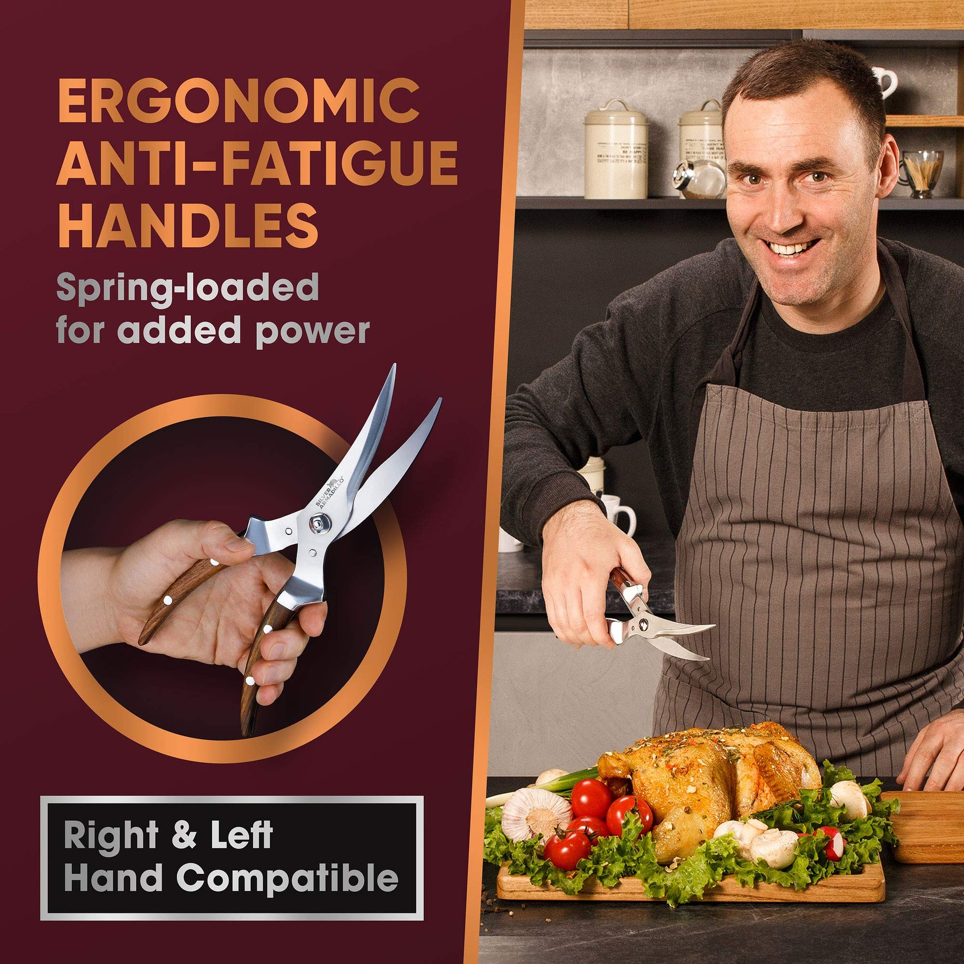 • MAKING FOOD PREPARATION EASIER - At Silver Armadillo we know how precious food preparation time can be. We bring you a versatile, heavy-duty pair of poultry scissors to make your life easier, quicker and more enjoyable in the kitchen. Whether you’re making a gourmet meal or cooking supper for the family this kitchen accessory will be your go-to helper. With wooden ergonomic handles, this culinary tool looks amazing displayed together with your knives in the kitchen.