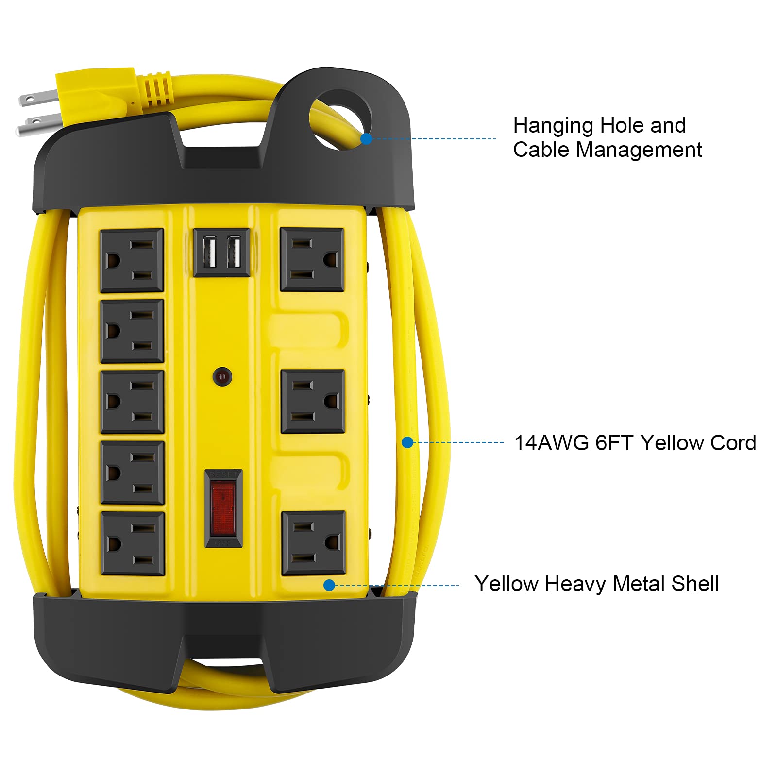 • Metal industrial power strip with yellow aluminum housing and black outlets, wall mountable and built-in usb ports design, perfect for hooking up all the gadgets at work.