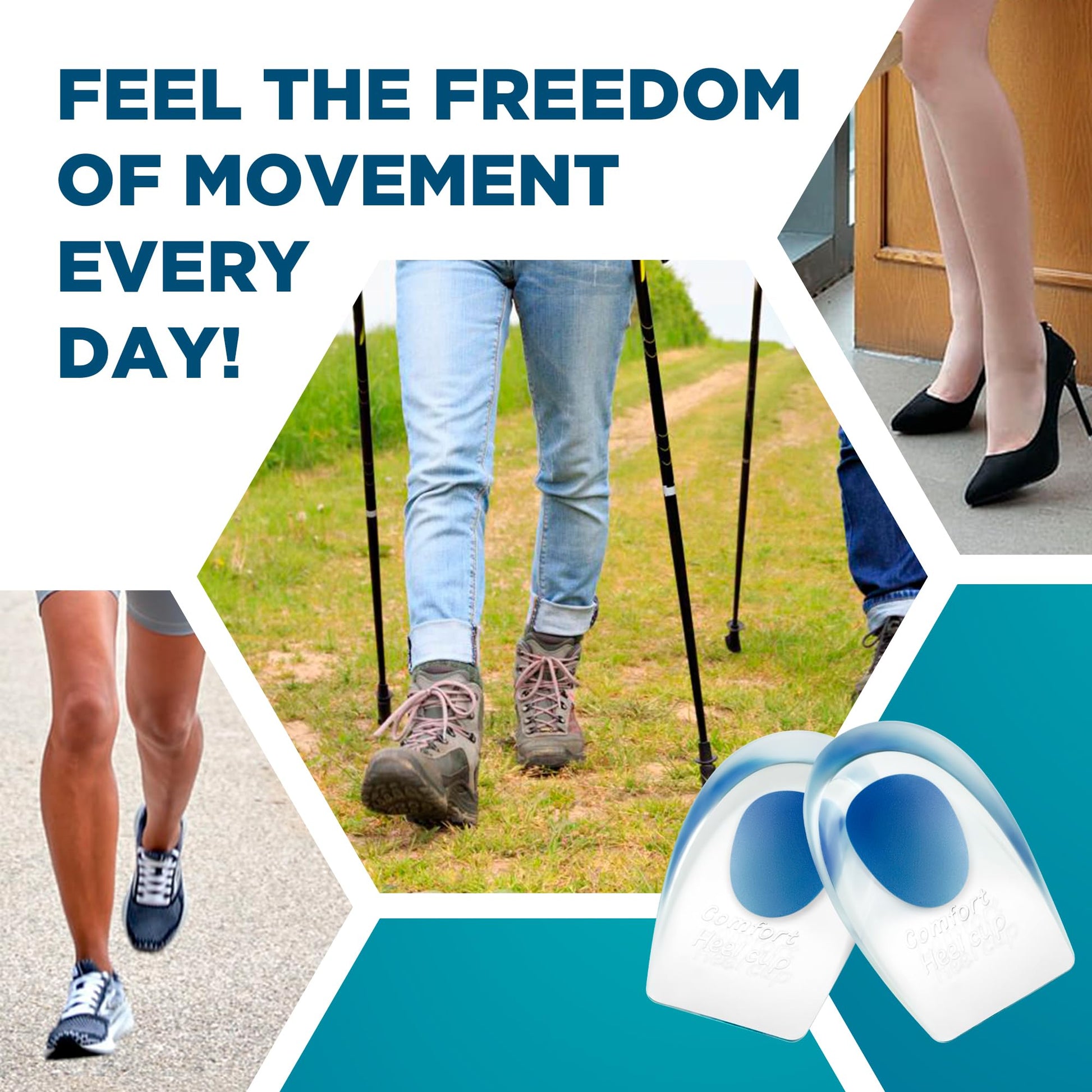 • You Get - This set includes one pair of comfortable gel heel cups that can be worn in most shoe styles, including athletic shoes, dress shoes, and boots. They can be worn all day whether you are playing sports, running, working, or standing all day. They cushion your heel and provide shock absorption relief