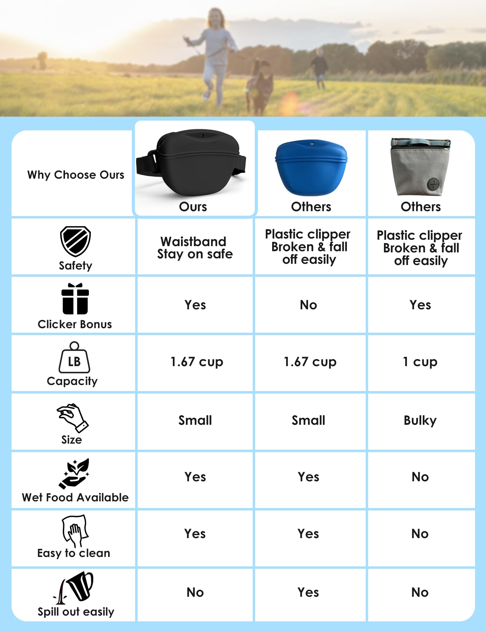 • 【Unique Waist Belt Design】Unlike other silicone dog training pouches, we have taken extensive time and effort to address the risk of plastic clips breaking or failing off. After careful consideration, we are proud to present our latest product that eliminates the worry of your pouch accidentally detaching during training sessions or walks. The waist belt is adjustable for waist sizes ranging from 25“ to 47”, ensuring a comfortable fit for users. Now, you can confidently focus on your training or outdoor activities without the concern of your pouch slipping off.