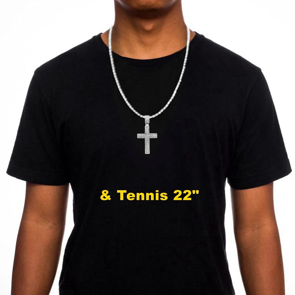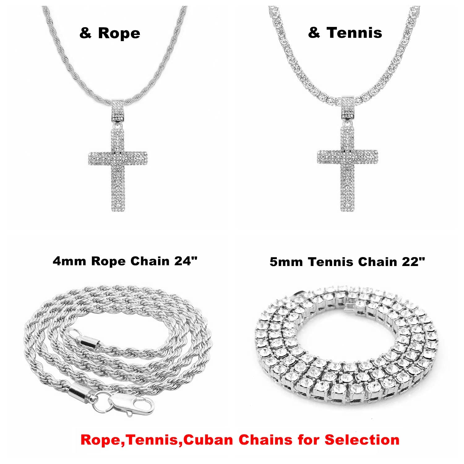 • Style/ Design:Iced out chains with diamond cross pendant necklace designs,which made with incredible details and craftsmanship.3 style chains with crosses for selection: 4mm rope chains 24'/5mm tennis chains 22'/10mm cuban link chains 20'