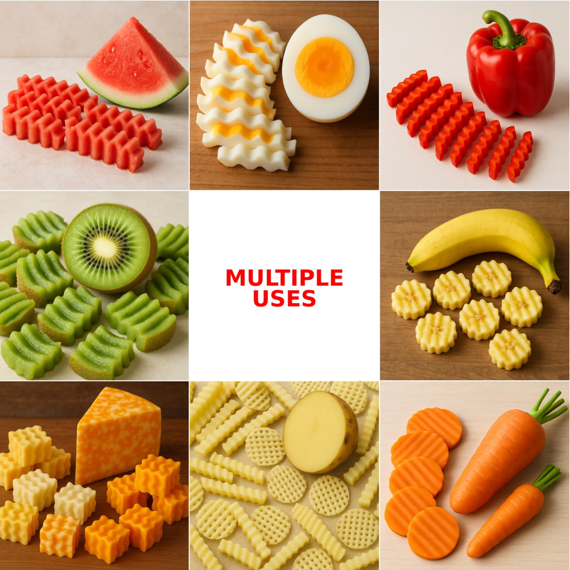 HIC Kitchen’s Crinkle-Cut Wave Slicer creates crinkle-cut and waffle fries, wavy potato chips, and decorative fruits and vegetables