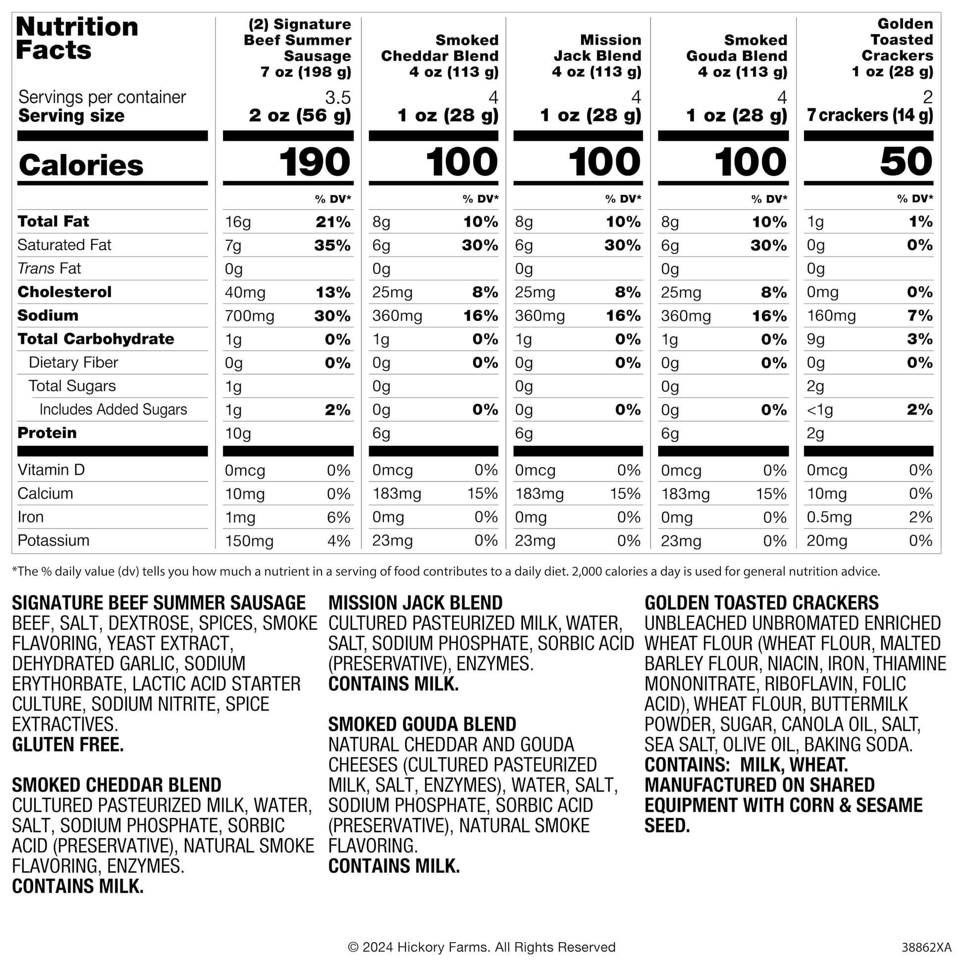 • MEAT & CHEESE: (2) 7 oz Signature Beef Summer Sausage, 4 oz Smoked Cheddar Blend, 4 oz Mission Jack Blend, 4 oz Smoked Gouda Blend