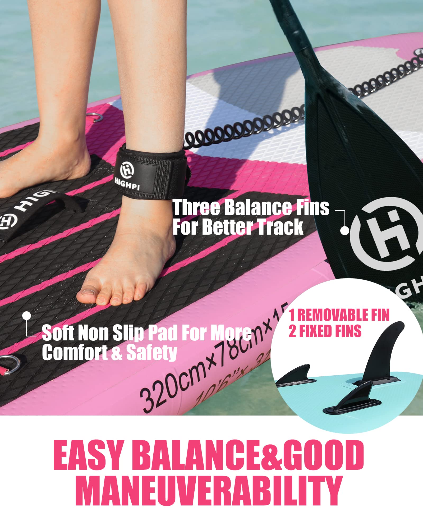 • Superior Stability with Unique Design: Highpi’s 10'6'' paddle board features a wide 33” platform and non-slip EVA deck pad, offering unmatched balance, control, and safety — ideal for beginners and advanced paddlers alike.