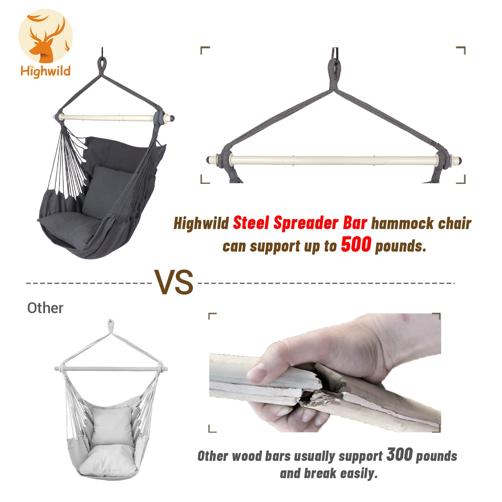 Highwild Hammock Chair Hanging Rope Swing - Max 500 Lbs - 2 Cushions Included - Steel Spreader Bar with Anti-Slip Rings - for Any Indoor or Outdoor Spaces (Grey)