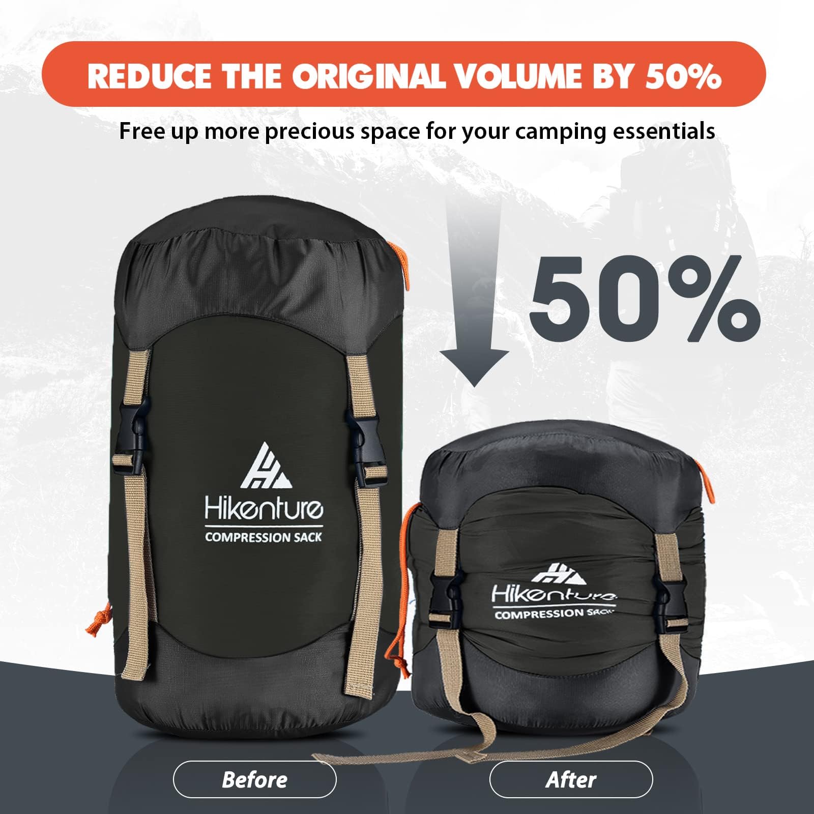 • SQUEEZE EVERY BIT OF SPACE OUT OF THE SACK! - We’ve equipped our stuff sack with two side release buckles and two adjustable straps. When you put items in it, pull the drawstring and close the lid, the inside items will not easily drop out. When you shorten the length of the straps, they can minimize the volume of the sleeping bag. This unique design of a compression sleeping bag means it won’t take up much room in your backpack and can make your trip more convenient and comfortable.