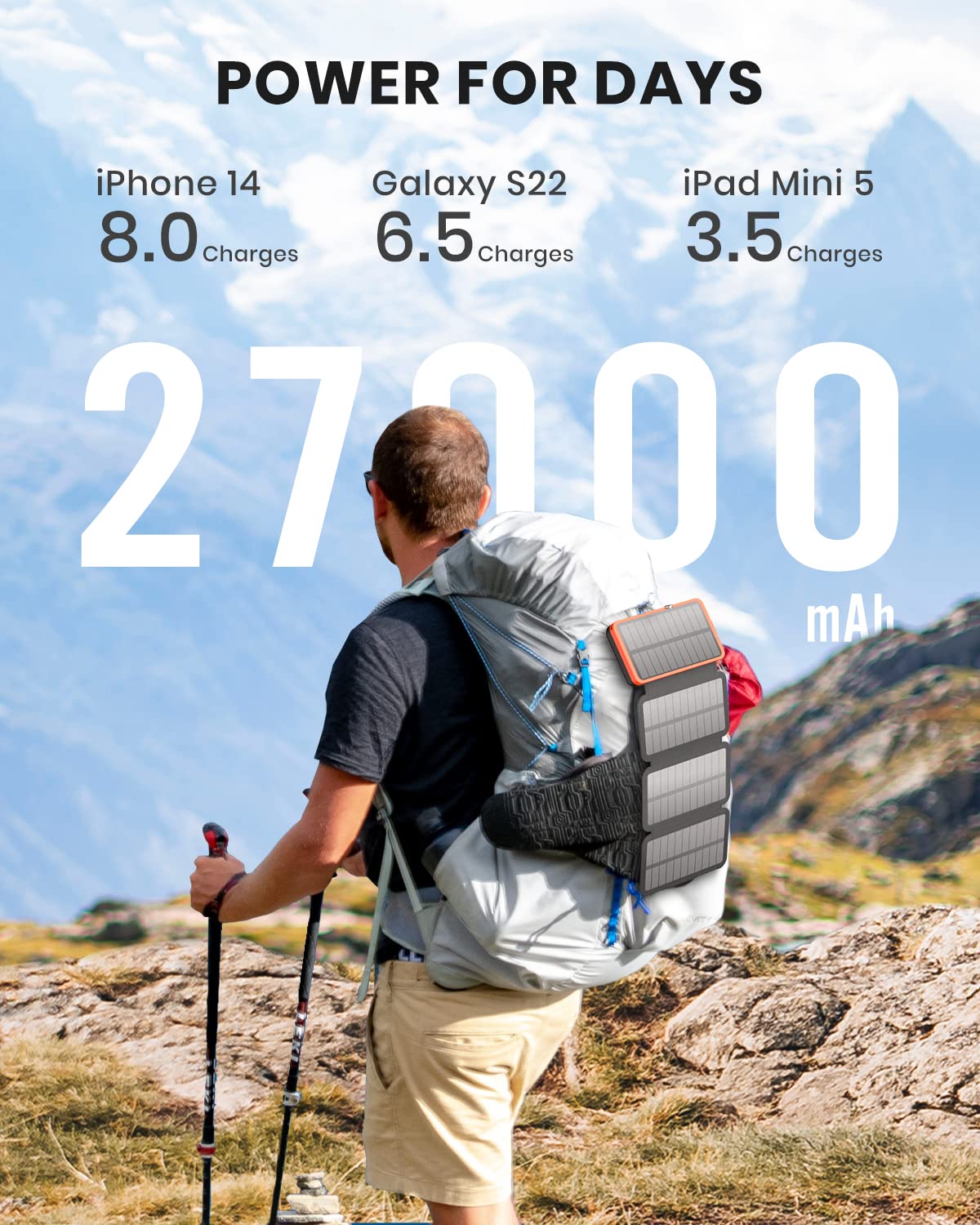 • Power for Days: The solar charger boasts a massive 27000mAh capacity, allowing you to charge an iPhone 8 times or a tablet 3.5 times before needing to recharge the power bank itself.