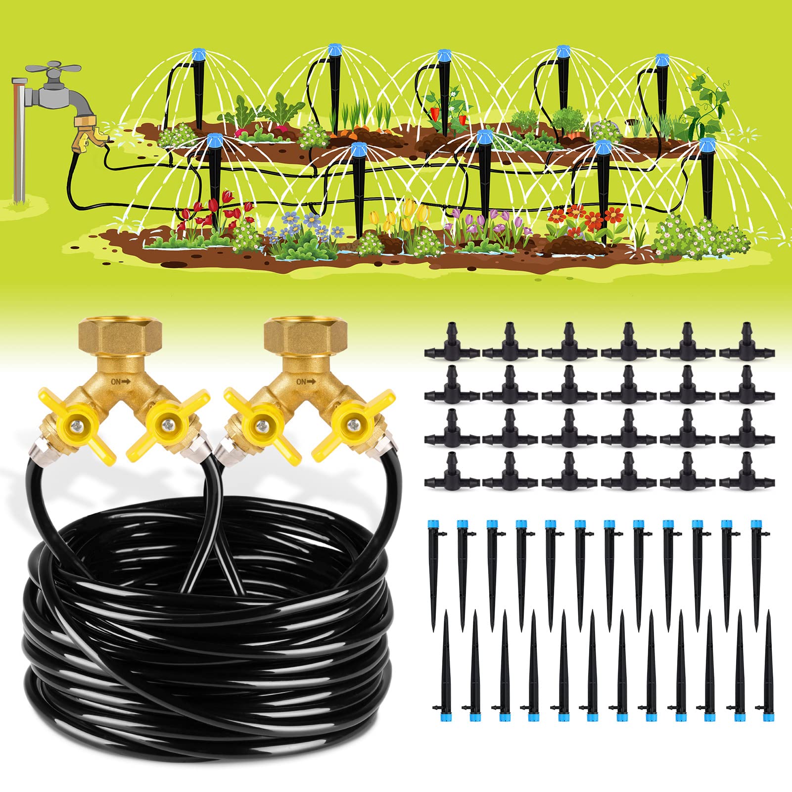 • The Whole Kit to Make The Drip System: This automatic drip irrigation kit includes all the accessories to make a drip irrigation system. 98.4 FT 1/4'' black tubing, 2pcs brass splitter adapter, 24pcs Tee-connectors, 24pcs blue drip emitters