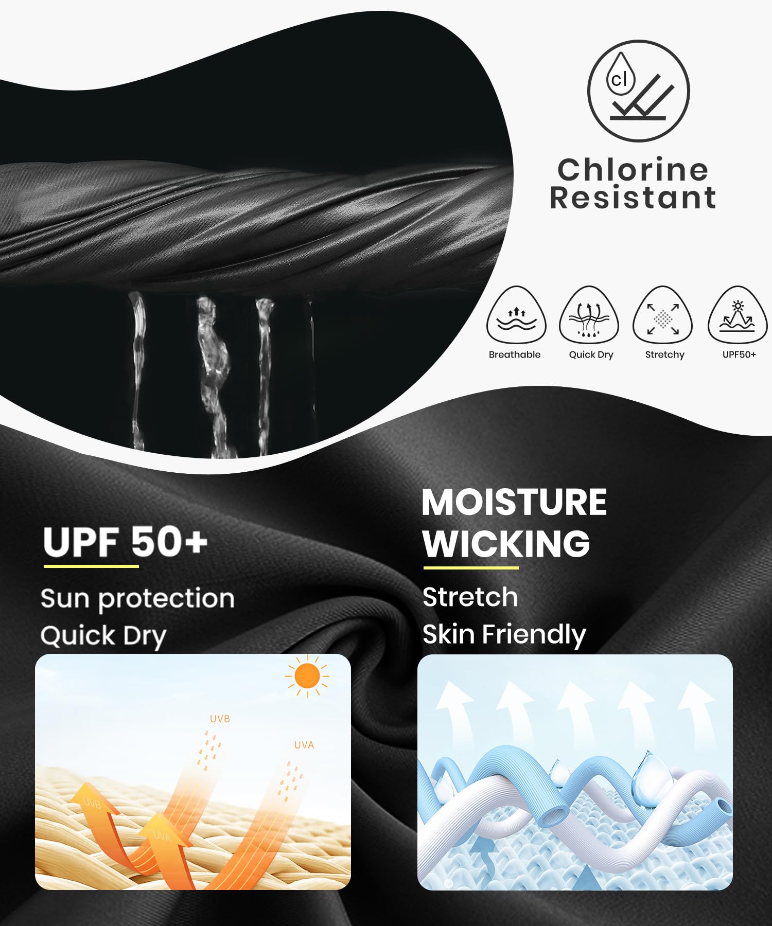 • Stretch,quick-drying,durable and lightweight fabric with excellent moisture-wicking and breathability keeps you cool and dry while surfing or workout.