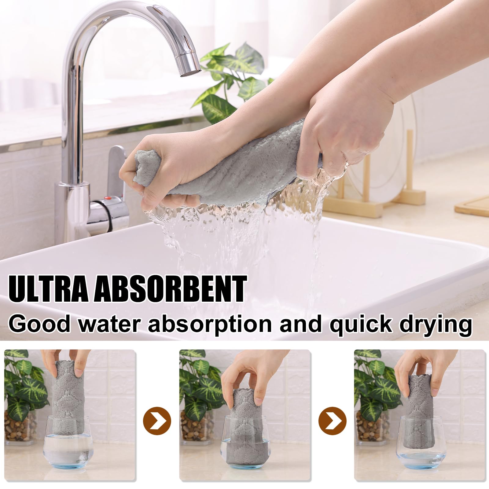 • √Ultra Absorbent: With a plush microfiber design, these kitchen washcloths are super absorbent for quick clean-up of spills, wiping oil stains and very durable for use over and over without losing effectiveness. Ideal for drying dishes and kitchen cleaning.