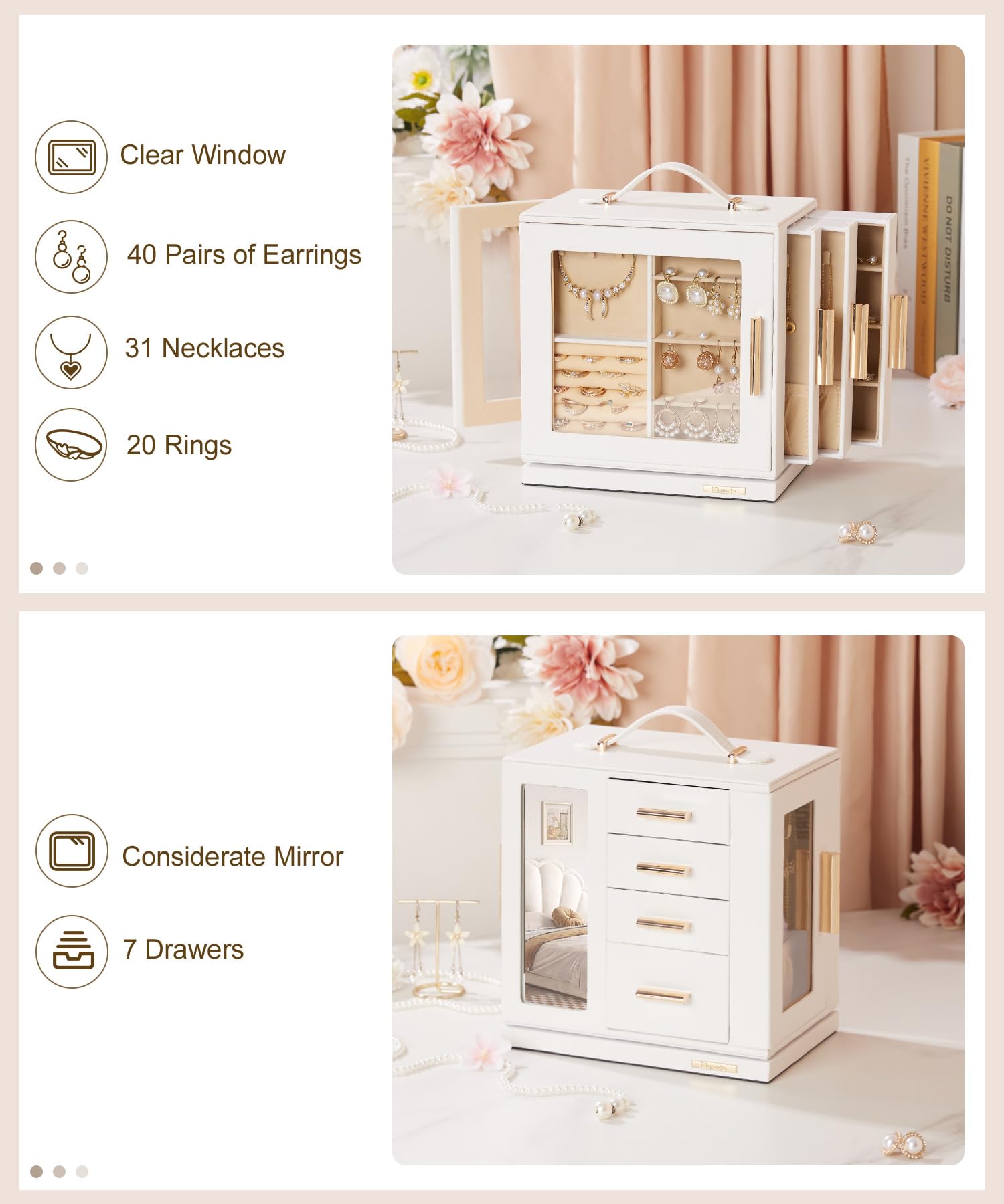 Homde Jewelry Box 360° Rotating, Necklace Earring Organizer with Transparent Window, Mirror, 7 Drawers, Large Ring Display Storage Case for Girls Women (White)