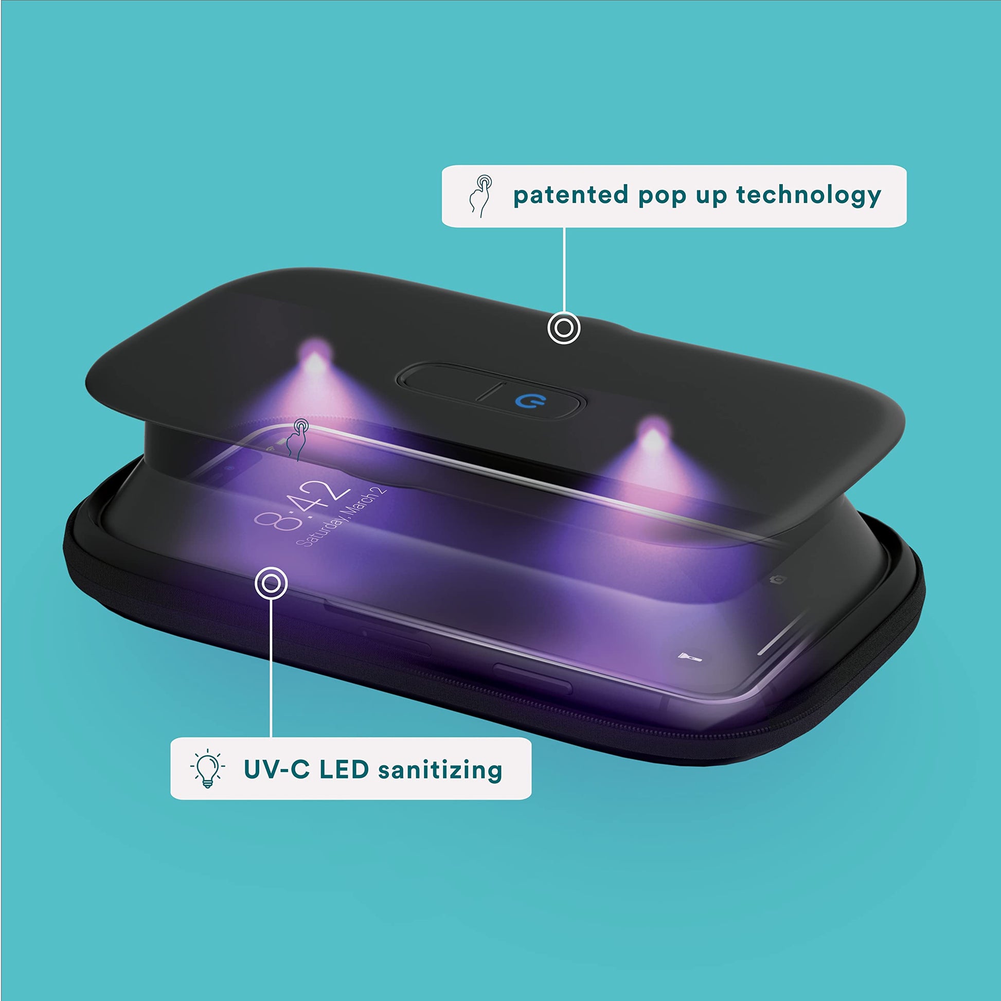 • PORTABLE PROTECTION - Keep your essential items clean and sanitized at home or on the go by utilizing patented pop-up technology and powerful UV-C LED sanitizing; after using the phone sanitizer, conveniently collapse flat to transport