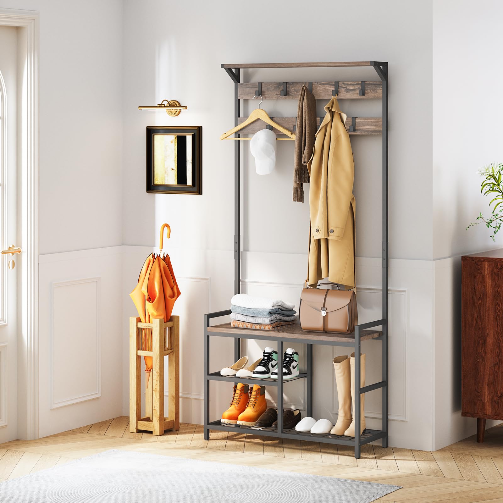 • [ 3 in 1 Design ] Our hall tree offers numerous hooks for hanging jackets, coats or bags. The high with low mesh shoe storage rack is capable to hold shoes, sneakers and high boots. Also, there is a seat bench for sitting (330 lb weight limit).