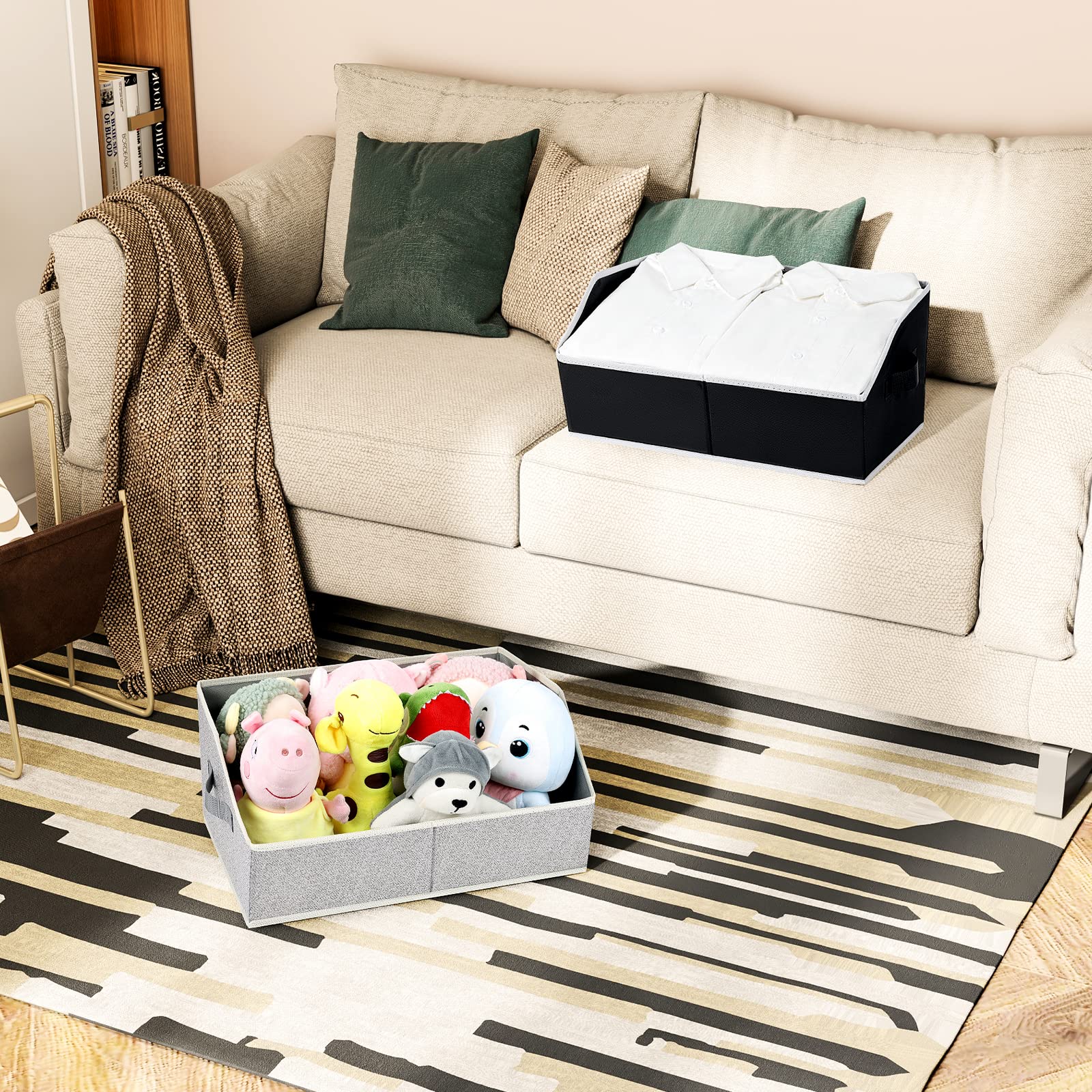 • Multipurpose Cubes: Measuring 16.53' L x 11' W x 7.87' H, these decorative storage boxes are ideal for storing clothes,towels, books, yarn, etc. Our fabric storage bins suitable for living room, bedroom, office, closets