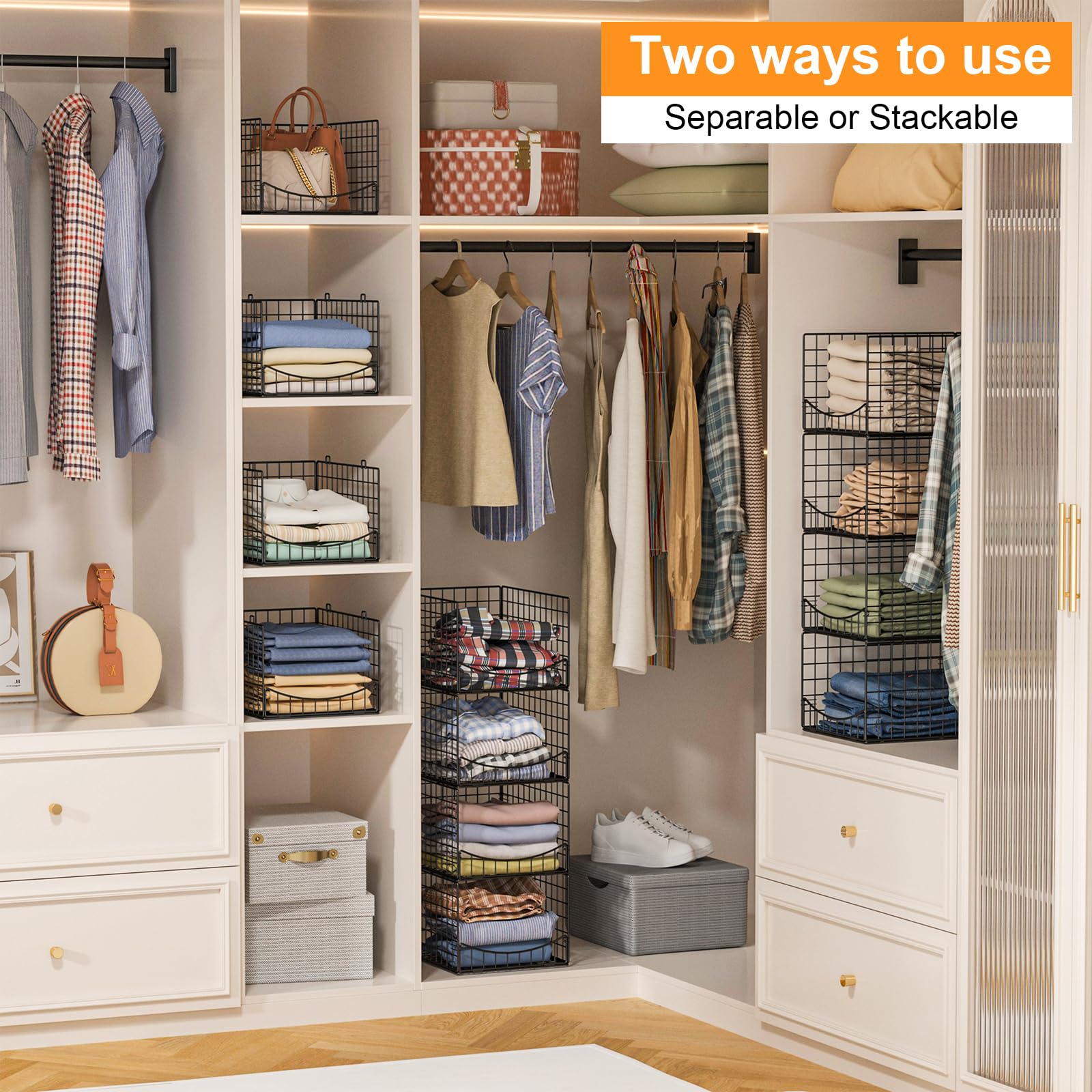 • [Premium Quality & Sturdy]: The wardrobe organizer features high-quality carbon steel frames with matte black anti-rust coating that outlast flimsy fabric/plastic organizers, only wipe it with wet cloth for daily cleaning. With this simple and stylish looking closet storage bins, you can easily sort and access your clothes as needed