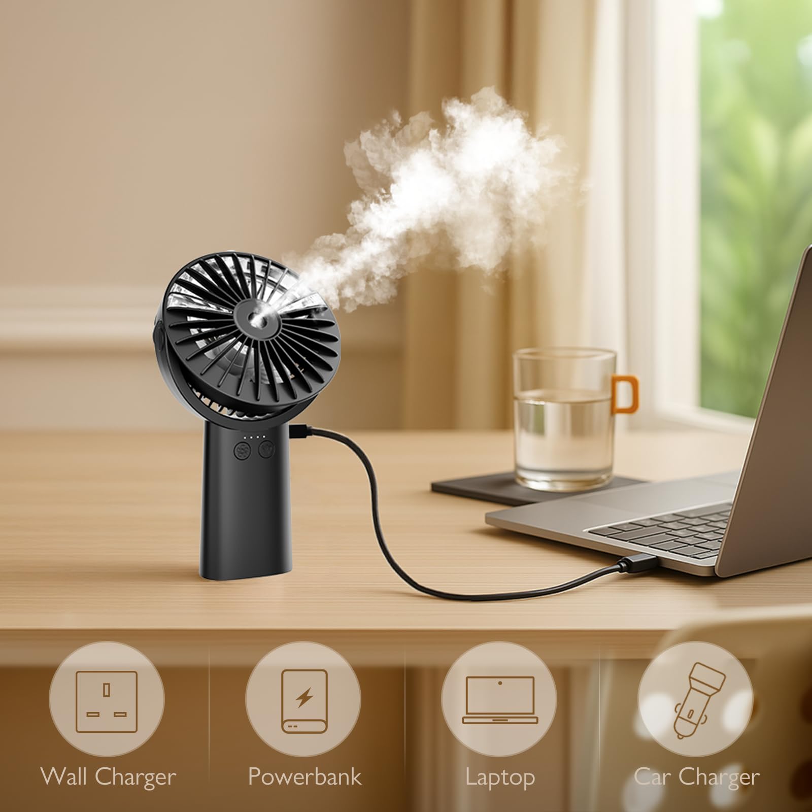 • SUMMER ESSENTIAL:The HonHey F11 Portable Misting Fan delivers instant cooling relief with powerful airflow + refreshing mist spray—perfect for hot weather, outdoor (camping, beach, hiking), or daily use (office, gym, travel). This 3-in-1 fan functions as a handheld cooler, adjustable desk fan (0°-90° tilt), and misting device—all in a compact, lightweight design. Ideal for post-workout cooldowns, hot flashes, or travel.