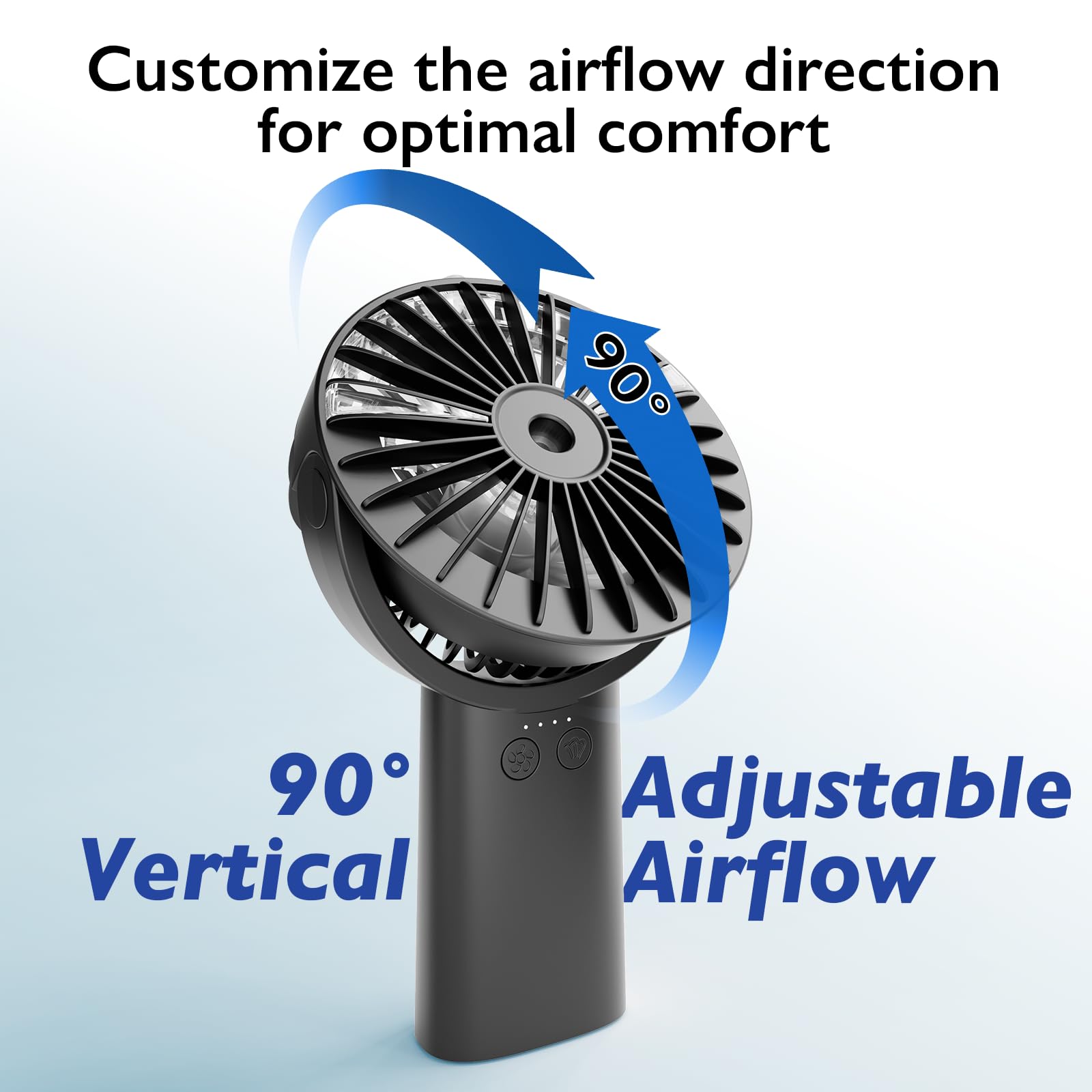 • MISTING FUCTION: Long press the switch to turn on the misting function, this portable fan actually can spray mist to lower the heat around your body. Perfect for lasting your makeup, keeping skin fresh or cooling after exercise. When the fan is turned on at the same time, it will spray intermittently. With a build-in 30ml water tank, it can be used for 30-60 minutes when filled with water.