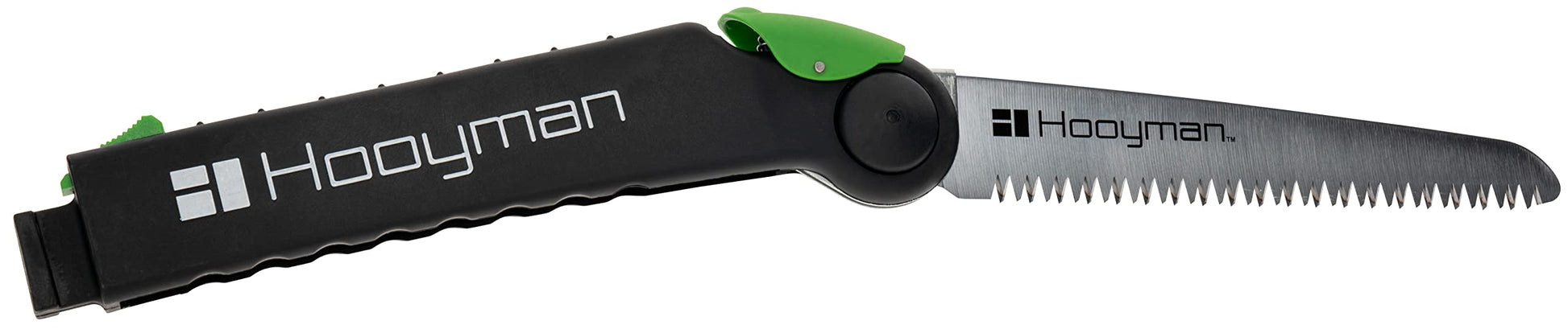 Hooyman offers premium extendible saws designed specifically for the hunter. Each section of the telescopic extension arm locks down individually, creating an incredibly sturdy saw that can extend up to 5 Feet. The folding saw slides and locks into the extension arm with a clever in-line channel groove for a remarkably tight connection. Uses a high carbon premium steel blade that features a special four edge tooth Megabite design for unmatched cutting. The blade locks back and easily folds down with the touch of a finger. The extension arms on the saw are constructed of aircraft grade aluminum in a super strong I-beam configuration. They are lightweight, sturdy and strong.