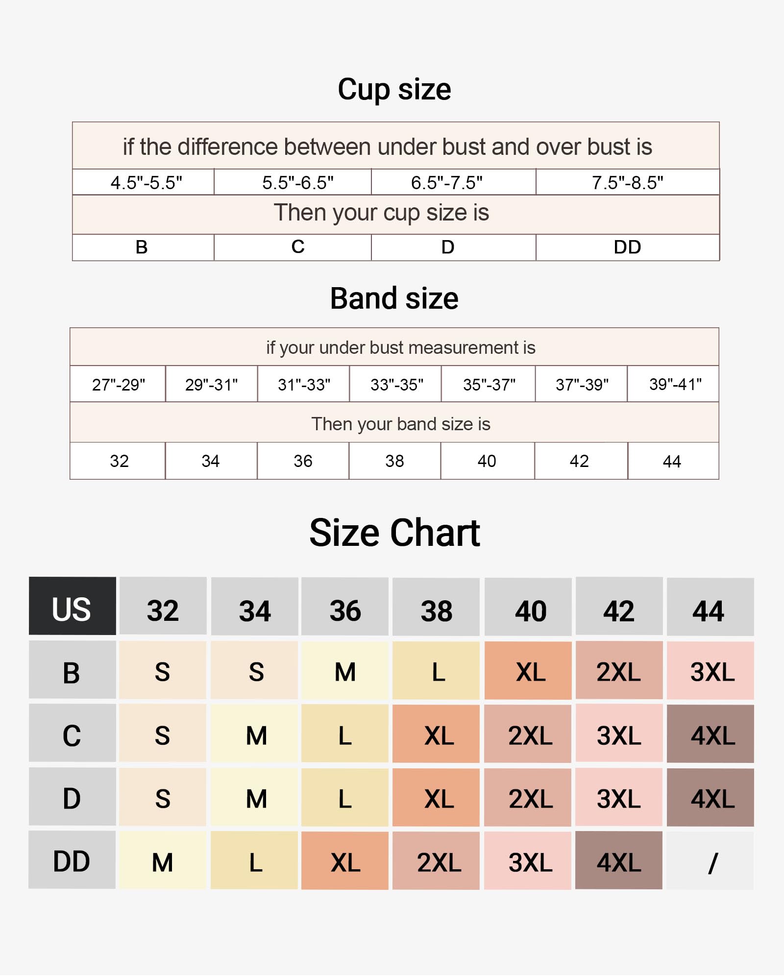 • Regular and Plus Size: Please read the size chart before ORDER: S(32B, 32C, 32D, 34B);M(32DD, 34C, 34D, 36B);L(34DD, 36C, 36D, 38B);XL(36DD, 38C, 38D, 40B);2XL(38DD, 40C, 40D, 42B);3XL(40DD, 42C, 42D, 44B );4XL(42DD, 44C, 44D). Our seamless bra for women has regular and plus size to fit most women's body type