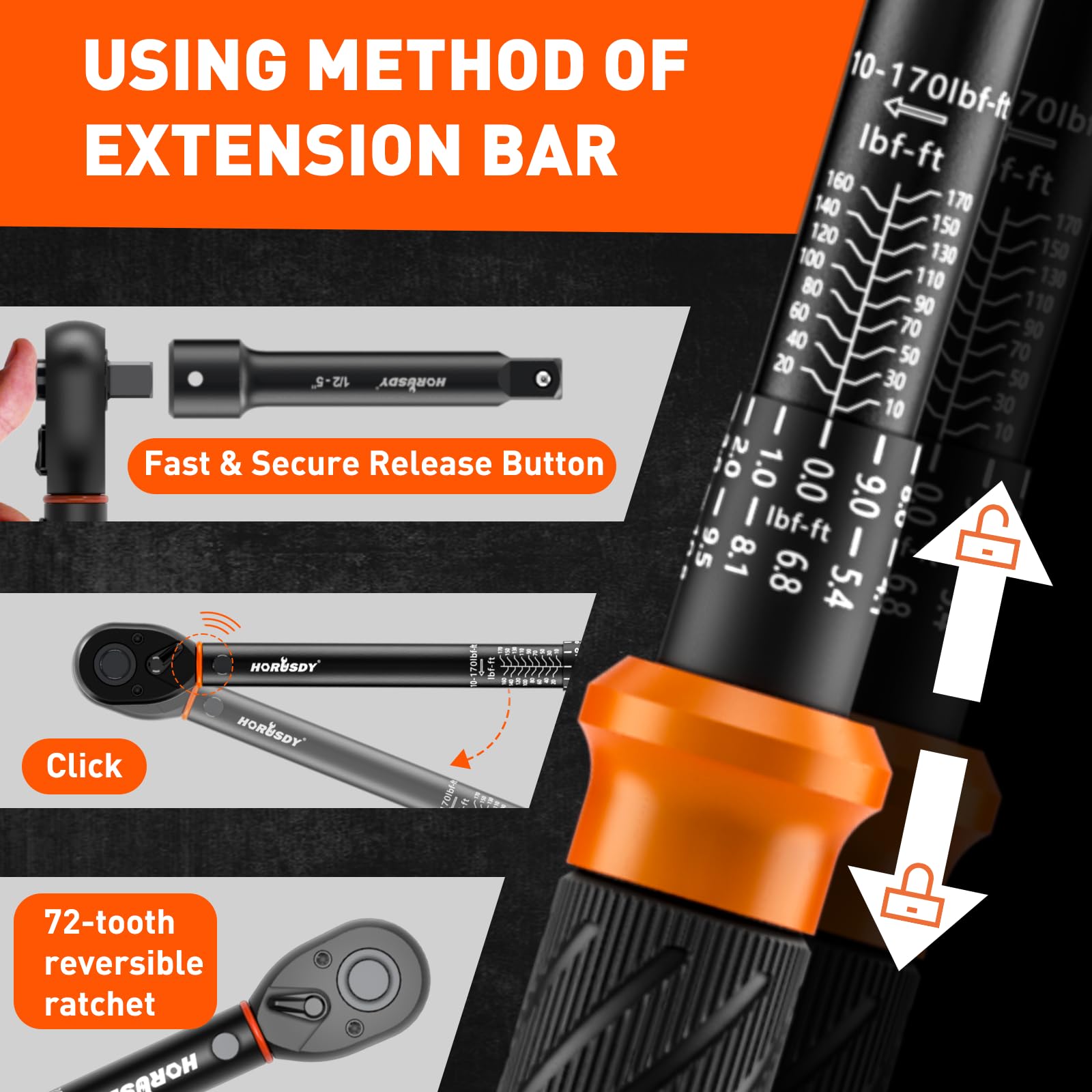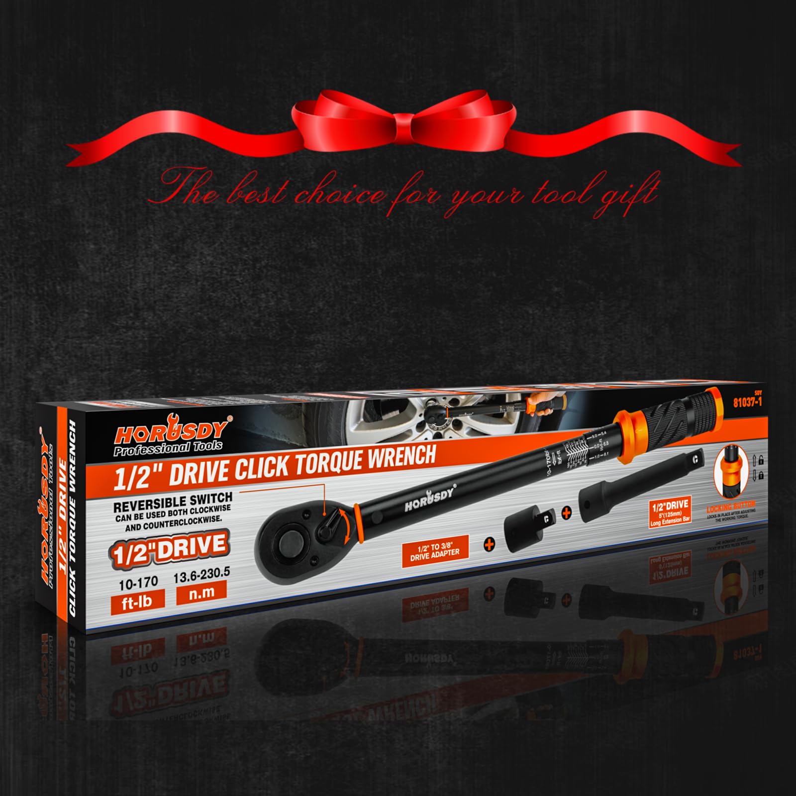 HORUSDY 1/2-Inch Drive Click Torque Wrench Set – 10–170 ft-lb / 13.6–230.5 Nm, ±3% Precision, Dual Scale, 72-Tooth Reversible Head with 5" Extension & Adapter for Car, Tire, and Motorcycle Use