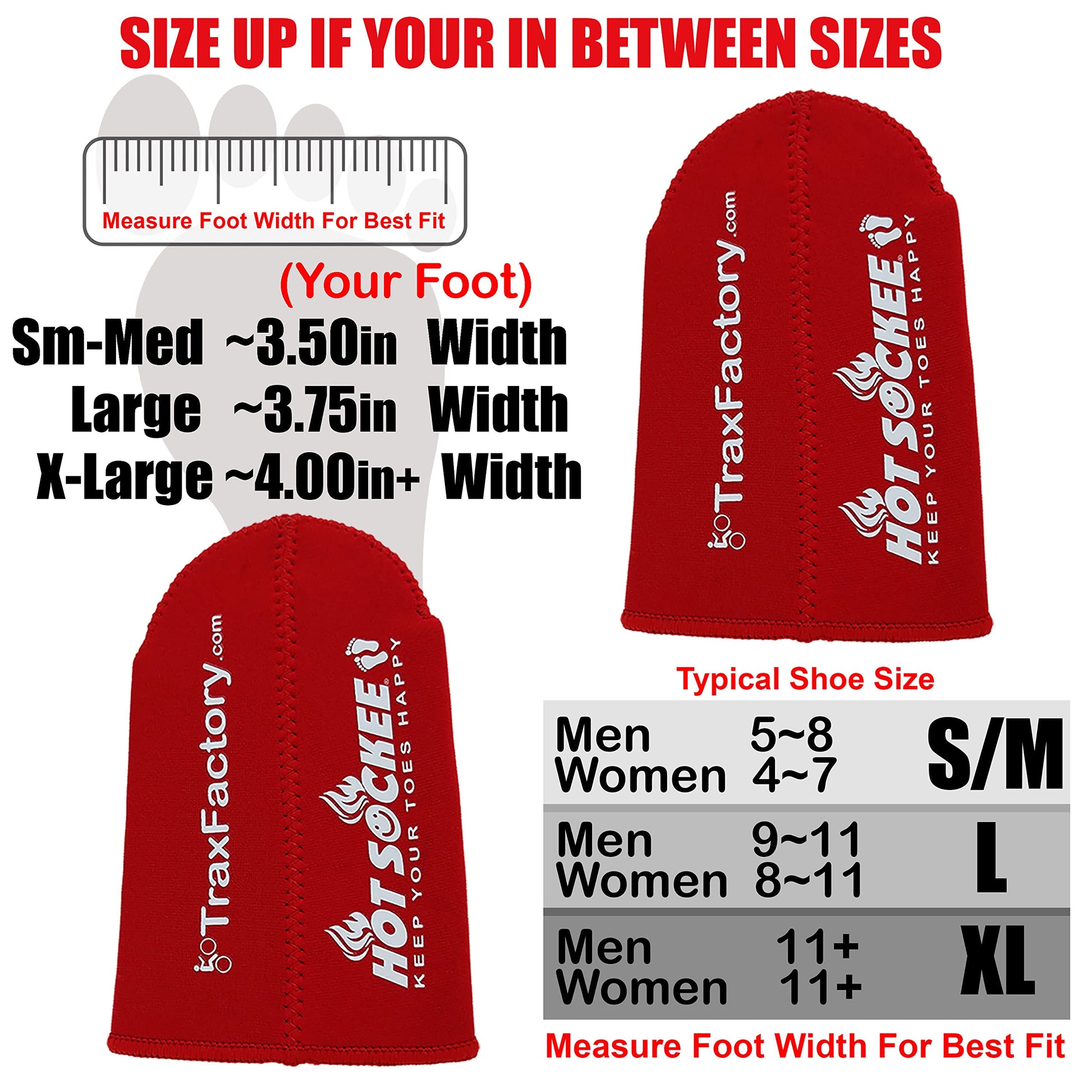 • Three sizes for excellent fit. Please use our fit chart image. Measure your foot width, proper fit is important for max warmth. Our neoprene toe warmers are thin enough for a great cozy fit and thick enough to provide extra warmth, insulation and comfort. Works in any type of shoe or boot. Absolutely great for snowboard, ski, hunting, fishing waders, construction and work boots. Sport, casual, dress or athletic shoes Hot Sockee can help keep your toes warmer. Raynauds cold toe relief.