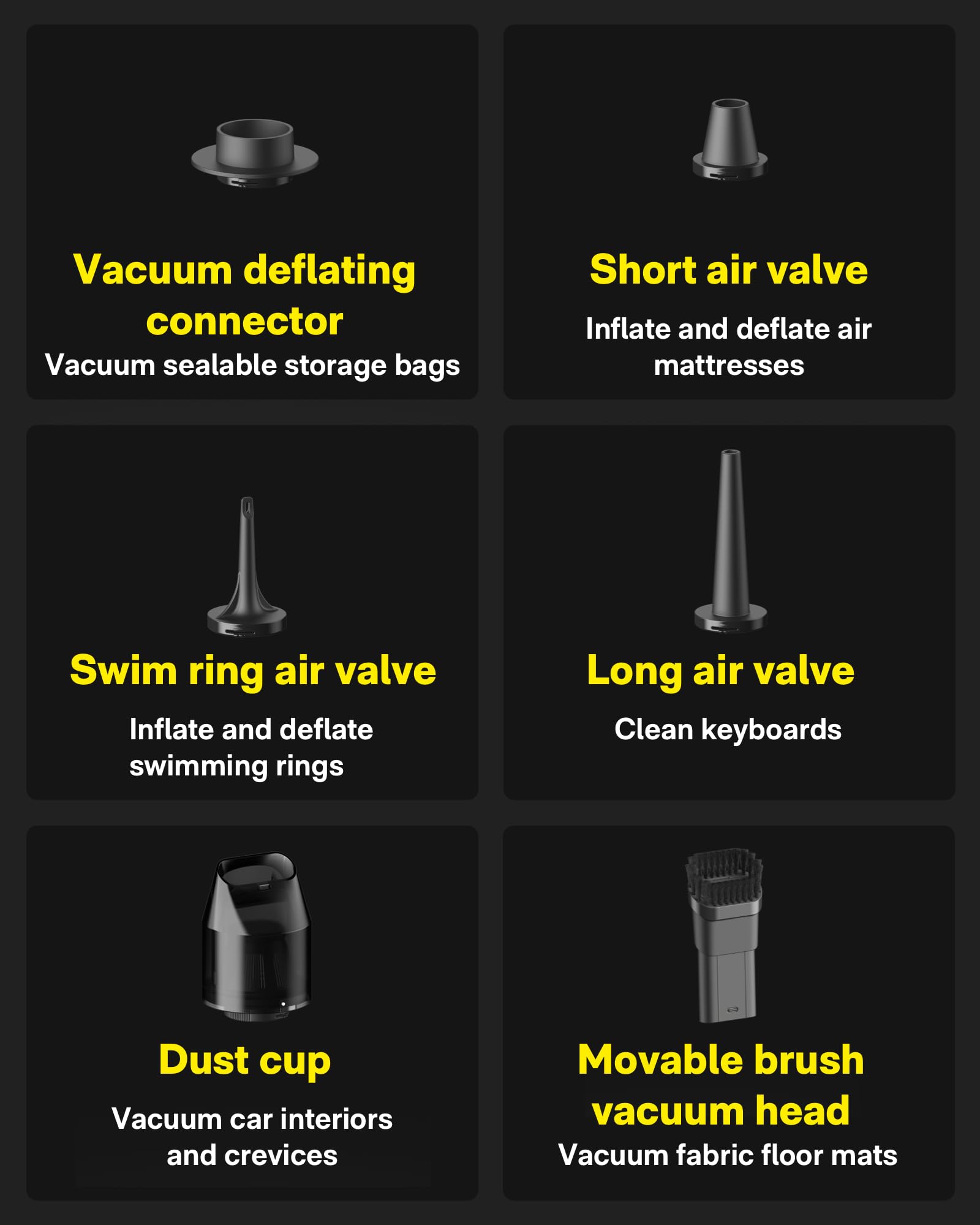 • VERSATILE ACCESSORIES: 1 x Vacuum Deflating Connector, 1 x Short Air Valve, 1 x Swim Ring Air Valve, 1 x Long Air Valve, 1 x Dust Cup, 1 x Movable Brush Vacuum Head, 1 x Type-C Cable. *When vacuuming, be sure to insert the dust cup first and refrain from using other attachments to vacuum directly