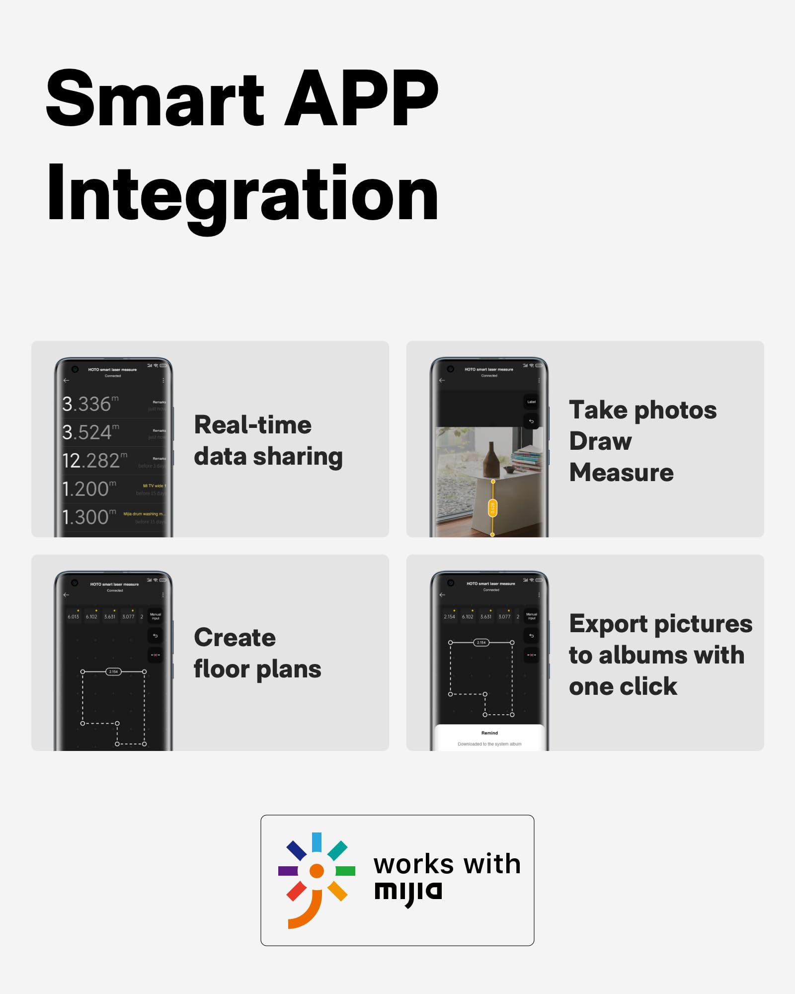 • 【Bluetooth Connection】Laser tape measure connects to the Mi Home app via Bluetooth to enable functions such as data storage and sharing, floor plan drawing, unit conversion (M/Ft), and photo export