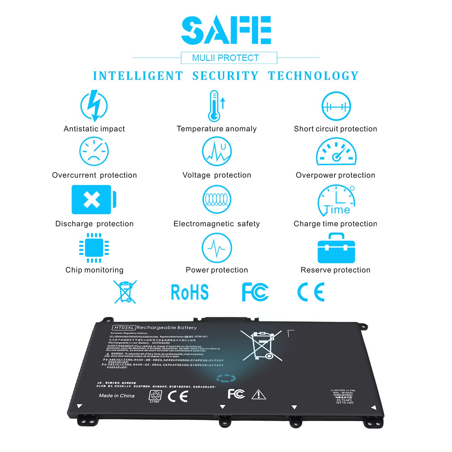 • SECURITY : SECURITY : Emanjor HT03XL batteries have passed strict intelligent detection, such as short circuit protection, over voltage protection, discharge protection, over current protection, which is very important for battery’s use cycle and safety. Also CE, FCC, RoHS certificated for our batteries. Every one of our replacement notebook batteries are tested to meet OEM specifications.
